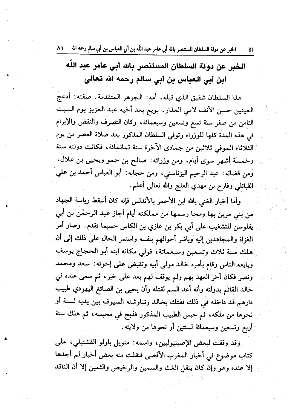 الْخَبَر عَن دولة السُّلْطَان الْمُسْتَنْصر بِاللَّه أبي عَامر عبد الله ابْن أبي الْعَبَّاس بن أبي سَالم رَحمَه الله تَعَالَى