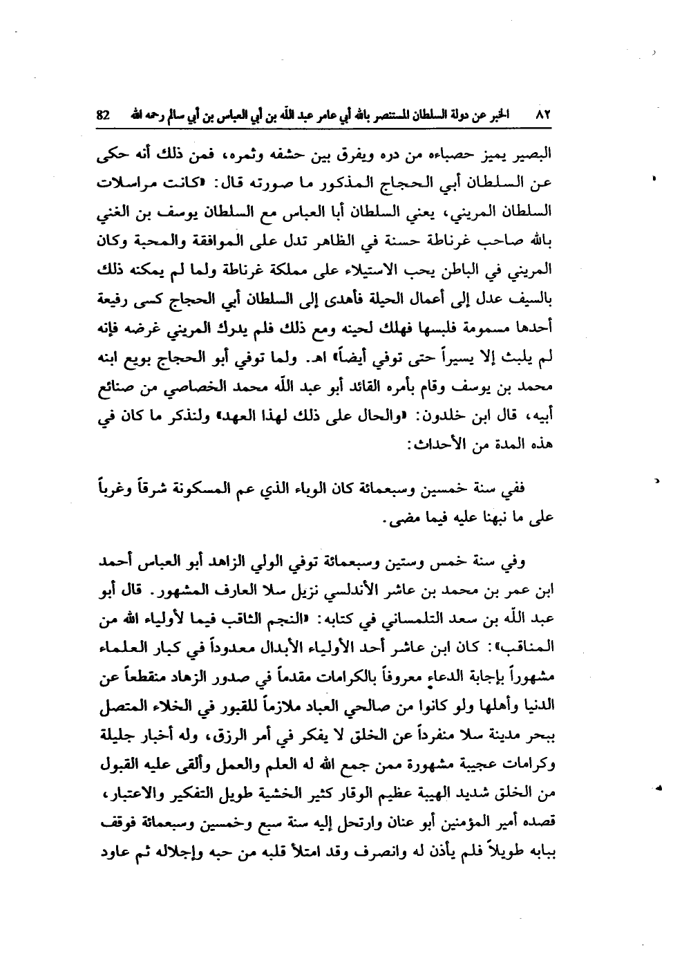 وَفِي سنة خمس وَسِتِّينَ وَسَبْعمائة توفّي الْوَلِيّ الزَّاهِد أَبُو الْعَبَّاس أَحْمد ابْن عمر بن مُحَمَّد بن عَاشر الأندلسي نزيل سلا الْعَارِف الْمَشْهُور قَالَ أَبُو عبد الله بن سعد التلمساني فِي كِتَابه النَّجْم الثاقب فِيمَا لأولياء الله من المناقب كَانَ ابْن عَاشر أحد الْأَوْلِيَاء الأبدال معدودا فِي كبار الْعلمَاء مَشْهُورا بإجابة الدُّعَاء مَعْرُوفا بالكرامات مقدما فِي صُدُور الزهاد مُنْقَطِعًا عَن الدُّنْيَا وَأَهْلهَا وَلَو كَانُوا من صالحي الْعباد ملازما للقبور فِي الْخَلَاء الْمُتَّصِل ببحر مَدِينَة سلا مُنْفَردا عَن الْخلق لَا يفكر فِي أَمر الرزق وَله أَخْبَار جليلة وكرامات عَجِيبَة مَشْهُورَة مِمَّن جمع الله لَهُ الْعلم وَالْعَمَل وَألقى عَلَيْهِ الْقبُول من الْخلق شَدِيد الهيبة عَظِيم الْوَقار كثير الخشية طَوِيل التفكير وَالِاعْتِبَار قَصده أَمِير الْمُؤمنِينَ أَبُو عنان وارتحل إِلَيْهِ سنة سبع وَخمسين وَسَبْعمائة فَوقف بِبَابِهِ طَويلا فَلم يَأْذَن لَهُ وَانْصَرف وَقد امْتَلَأَ قلبه من حبه وإجلاله ثمَّ عاود