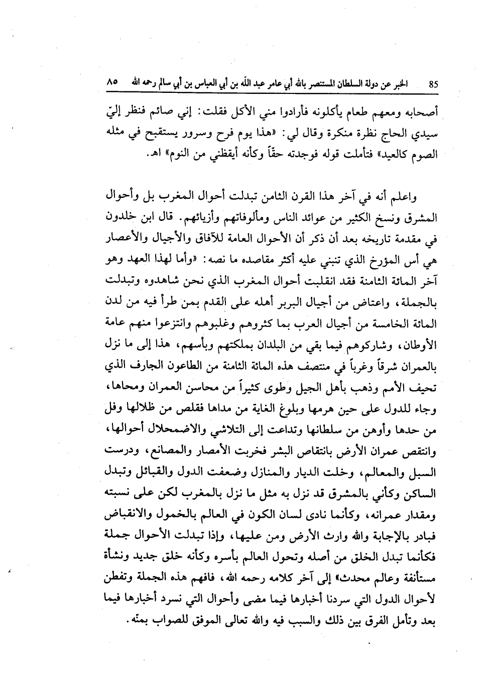 وَاعْلَم أَنه فِي آخر هَذَا الْقرن الثَّامِن تبدلت أَحْوَال الْمغرب بل وأحوال الْمشرق وَنسخ الْكثير من عوائد النَّاس ومألوفاتهم وأزيائهم قَالَ ابْن خلدون فِي مُقَدّمَة تَارِيخه بعد أَن ذكر أَن الْأَحْوَال الْعَامَّة للآفاق والأجيال والأعصار هِيَ أس المؤرخ الَّذِي تنبني عَلَيْهِ أَكثر مقاصده مَا نَصه وَأما لهَذَا الْعَهْد وَهُوَ آخر الْمِائَة الثَّامِنَة فقد انقلبت أَحْوَال الْمغرب الَّذِي نَحن شاهدوه وتبدلت بِالْجُمْلَةِ واعتاض من أجيال البربر أَهله على الْقدَم بِمن طَرَأَ فِيهِ من لدن الْمِائَة الْخَامِسَة من أجيال الْعَرَب بِمَا كثروهم وغلبوهم وانتزعوا مِنْهُم عَامَّة الأوطان وشاركوهم فِيمَا بَقِي من الْبلدَانِ بملكتهم وبأسهم هَذَا إِلَى مَا نزل بالعمران شرقا وغربا فِي منتصف هَذِه الْمِائَة الثَّامِنَة من الطَّاعُون الجارف الَّذِي تحيف الْأُمَم وَذهب بِأَهْل الجيل وطوى كثيرا من محَاسِن الْعمرَان ومحاها وَجَاء للدول على حِين هرمها وبلوغ الْغَايَة من مداها فقلص من ظلالها وفل من حَدهَا وأوهن من سلطانها وتداعت إِلَى التلاشي والاضمحلال أحوالها وانتقص عمرَان الأَرْض بانتقاص الْبشر فخربت الْأَمْصَار والمصانع ودرست السبل والمعالم وخلت الديار والمنازل وضعفت الدول والقبائل وتبدل السَّاكِن وَكَأَنِّي بالمشرق قد نزل بِهِ مثل مَا نزل بالمغرب لَكِن على نسبته وَمِقْدَار عمرانه وكأنما نَادَى لِسَان الْكَوْن فِي الْعَالم بالخمول والانقباض فبادر بالإجابة وَالله وَارِث الأَرْض وَمن عَلَيْهَا وَإِذا تبدلت الْأَحْوَال جملَة فَكَأَنَّمَا تبدل الْخلق من أَصله وتحول الْعَالم بأسره وَكَأَنَّهُ خلق جَدِيد ونشأة مستأنفة وعالم مُحدث إِلَى آخر كَلَامه رَحمَه الله فَافْهَم هَذِه الْجُمْلَة وتفطن لأحوال الدول الَّتِي سردنا أَخْبَارهَا فِيمَا مضى وأحوال الَّتِي نسرد أَخْبَارهَا فِيمَا بعد وَتَأمل الْفرق بَين ذَلِك وَالسَّبَب فِيهِ وَالله تَعَالَى الْمُوفق للصَّوَاب بمنه