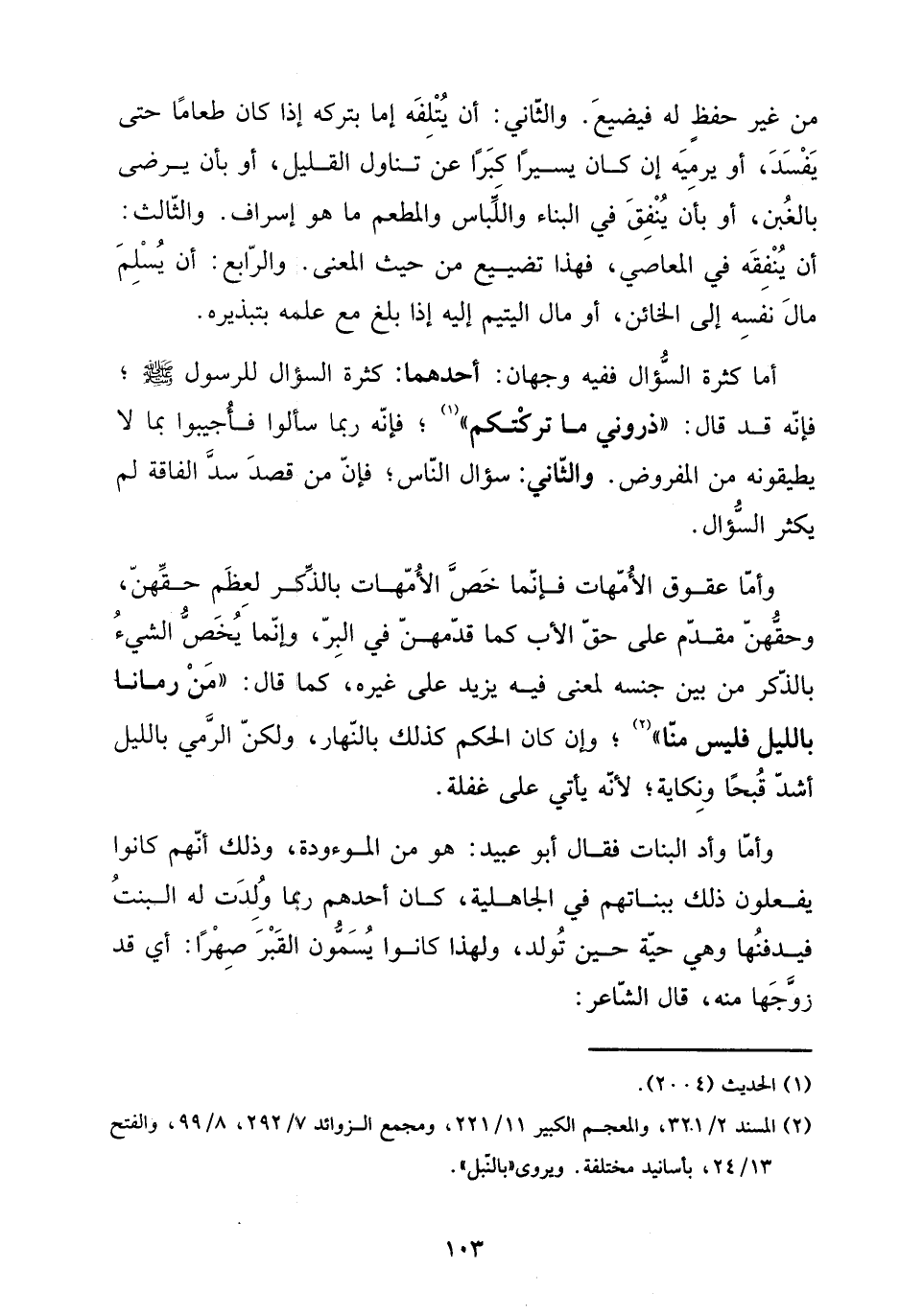 أما كَثْرَة السُّؤَال فَفِيهِ وَجْهَان: أَحدهمَا: كَثْرَة السُّؤَال للرسول صلى الله عَلَيْهِ وَسلم؛ فَإِنَّهُ قد قَالَ: " ذروني مَا تركتكم "؛ فَإِنَّهُ رُبمَا سَأَلُوا فأجيبوا بِمَا لَا يطيقُونَهُ من الْمَفْرُوض. وَالثَّانِي: سُؤال النَّاس؛ فَإِن من قصد سد الْفَاقَة لم يكثر السُّؤَال.