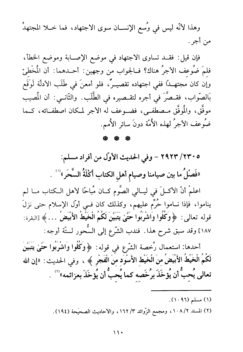 أَحدهَا: اسْتِعْمَال رخصَة الشَّرْع فِي قَوْله: {وكلوا وَاشْرَبُوا حَتَّى يتَبَيَّن لكم الْخَيط الْأَبْيَض من الْخَيط الْأسود من الْفجْر} ، وَفِي الحَدِيث: " إِن الله تَعَالَى يحب أَن يُؤْخَذ بِرُخصِهِ كَمَا يحب أَن يُؤْخَذ بِعَزَائِمِهِ.