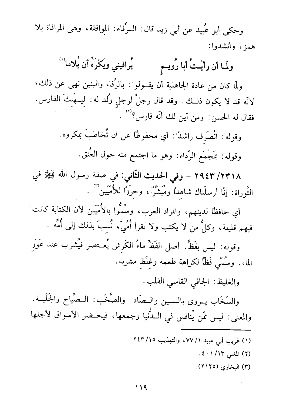 2318 - / 2943 - وَفِي الحَدِيث الثَّانِي: فِي صفة رَسُول الله صلى الله عَلَيْهِ وَسلم فِي التَّوْرَاة: إِنَّا أَرْسَلْنَاك شَاهدا وَمُبشرا، وحرزا للأميين.