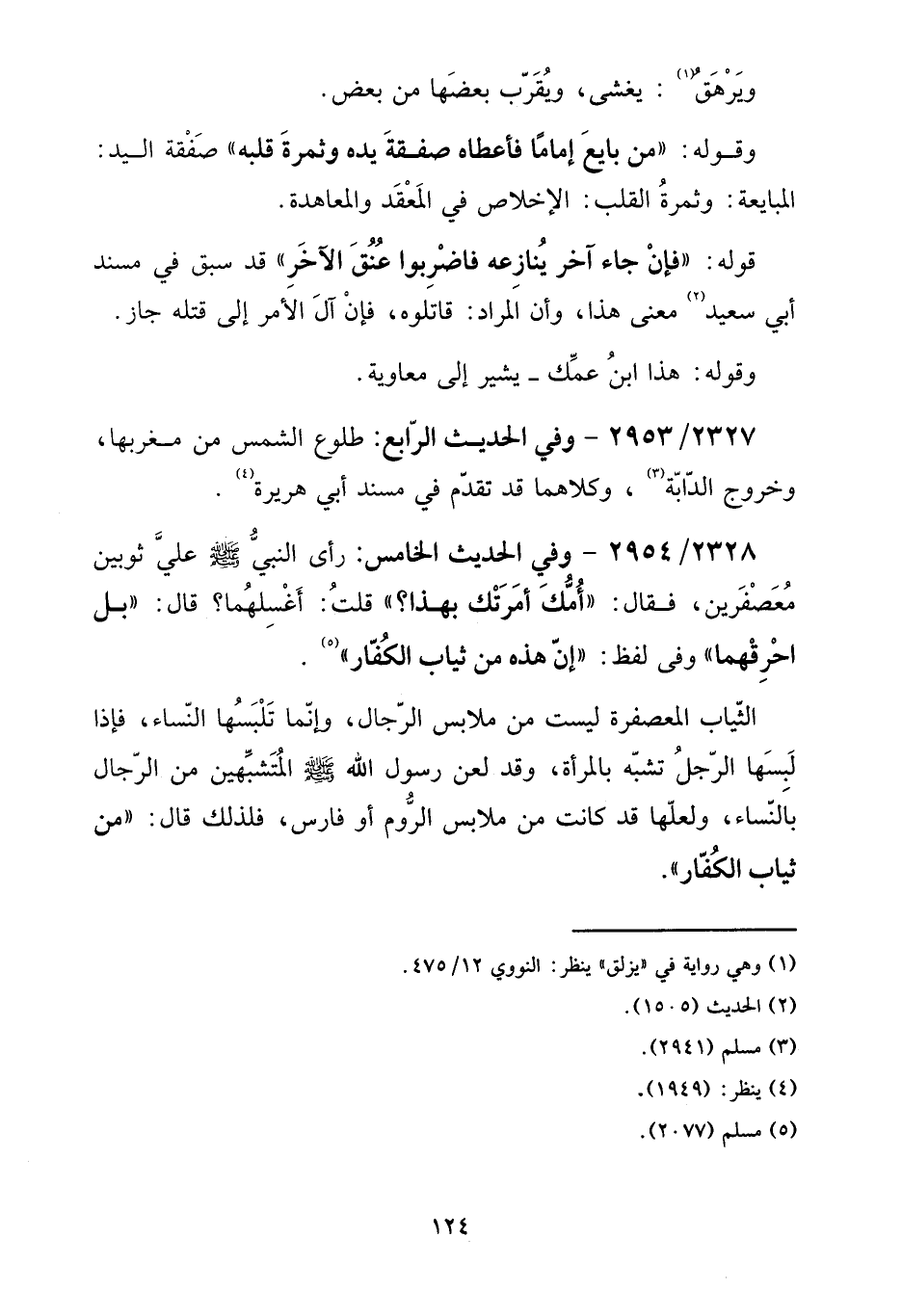 2328 - / 2954 - وَفِي الحَدِيث الْخَامِس: رأى النَّبِي صلى الله عَلَيْهِ وَسلم عَليّ ثَوْبَيْنِ معصفرين، فَقَالَ: " أمك أَمرتك بِهَذَا؟ " قلت: أغسلهما؟ قَالَ: " بل احرقهما " وَفِي لفظ: " إِن هَذِه من ثِيَاب الْكفَّار ".