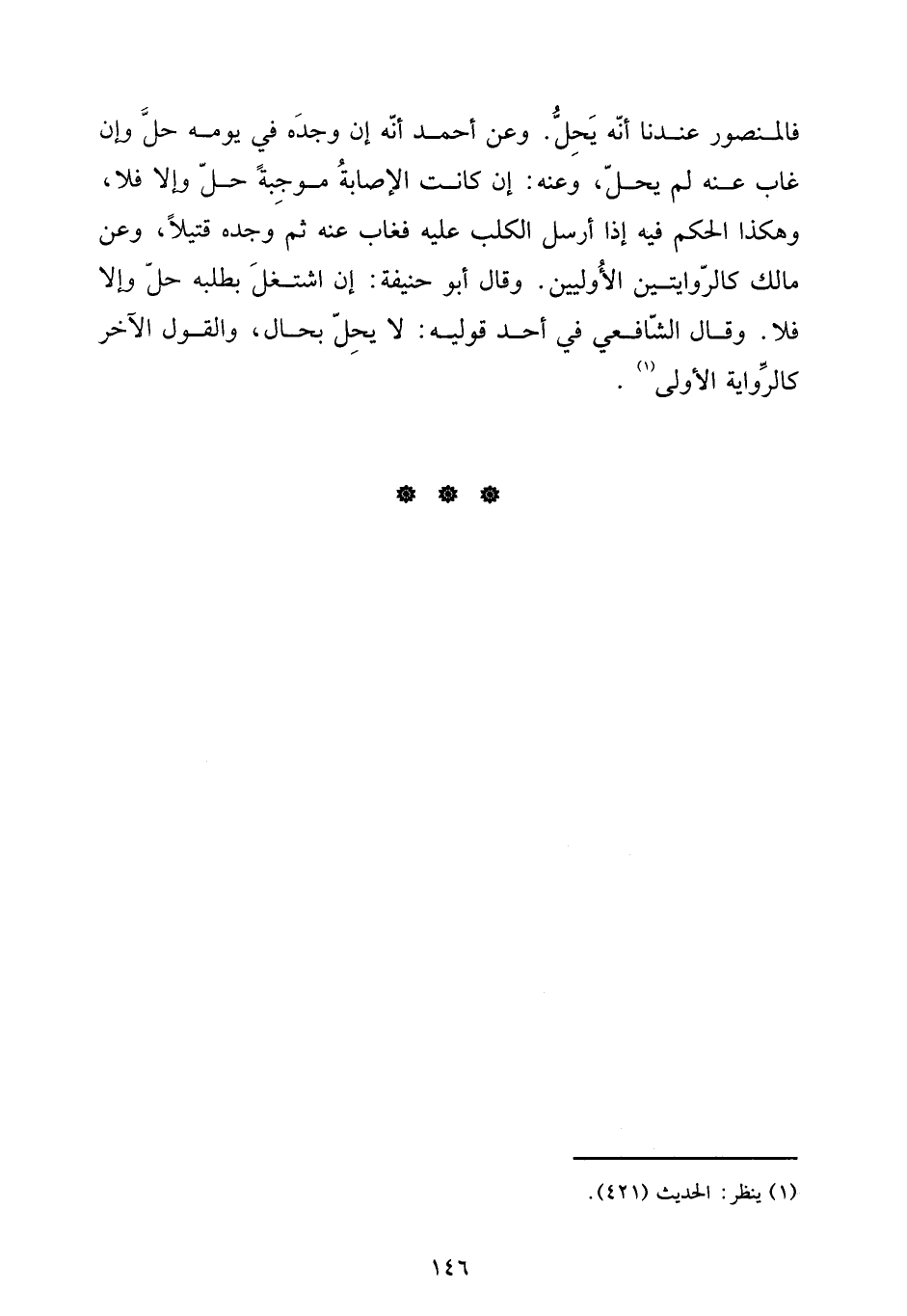فالمنصور عندنَا أَنه يحل. وَعَن أَحْمد أَنه إِن وجده فِي يَوْمه حل وَإِن غَابَ عَنهُ لم يحل، وَعنهُ: إِن كَانَت الْإِصَابَة مُوجبَة حل وَإِلَّا فَلَا، وَهَكَذَا الحكم فِيهِ إِذا أرسل الْكَلْب عَلَيْهِ فَغَاب عَنهُ ثمَّ وجده قَتِيلا، وَعَن مَالك كالروايتين الْأَوليين. وَقَالَ أَبُو حنيفَة: إِن اشْتغل بِطَلَبِهِ حل وَإِلَّا فَلَا. وَقَالَ الشَّافِعِي فِي أحد قوليه: لَا يحل بِحَال، وَالْقَوْل الآخر كالرواية الأولى.