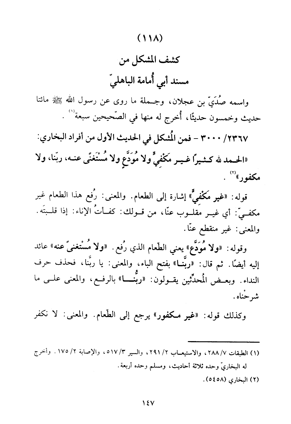 2367 - / 3000 - فَمن الْمُشكل فِي الحَدِيث الأول من أَفْرَاد البُخَارِيّ: " الْحَمد لله كثيرا غير مكفي وَلَا مُودع وَلَا مُسْتَغْنى عَنهُ، رَبنَا، وَلَا مكفور ".