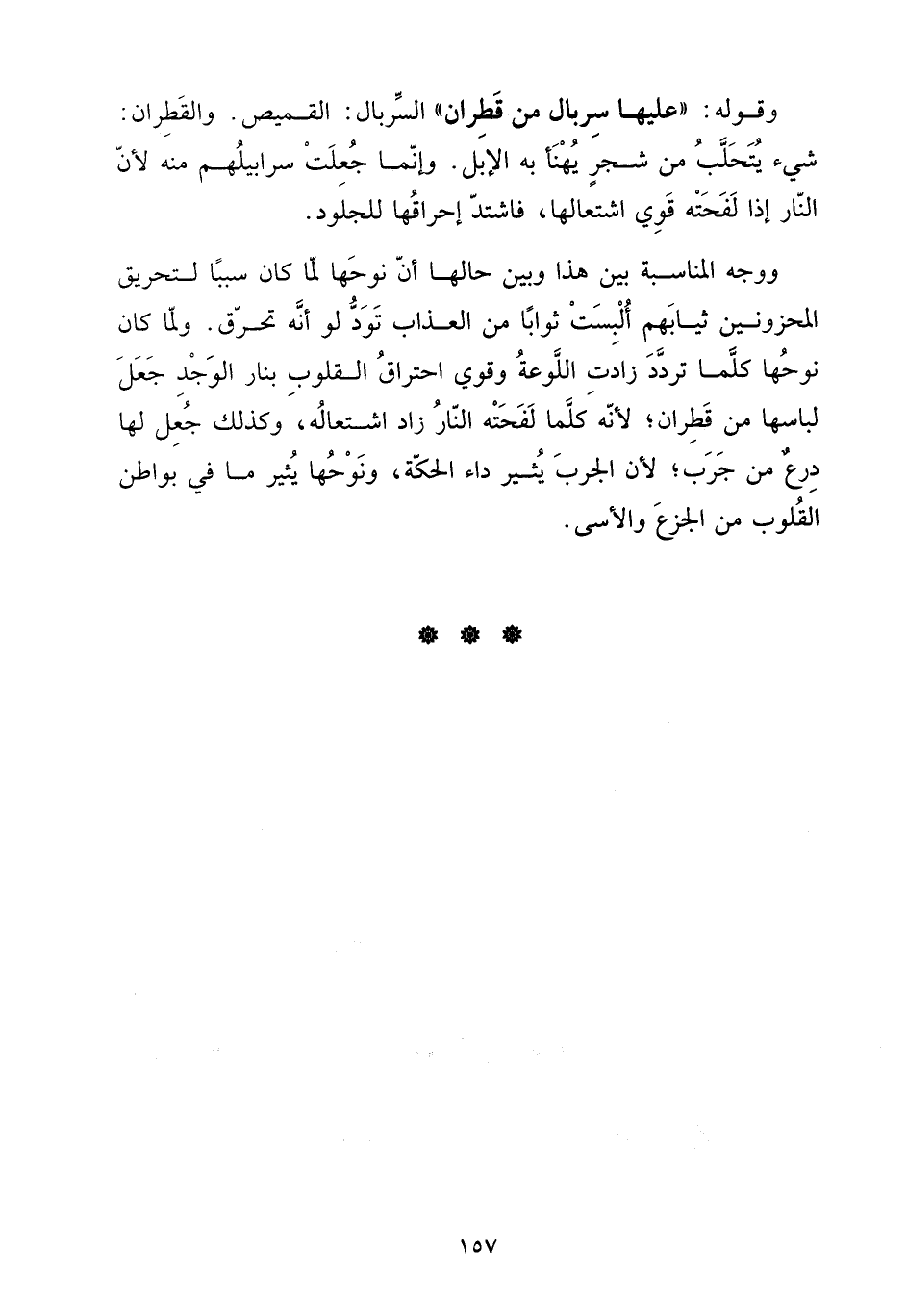 وَقَوله: " عَلَيْهَا سربال من قطران " السربال: الْقَمِيص. والقطران: شَيْء يتحلب من شجر يهنأ بِهِ الْإِبِل. وَإِنَّمَا جعلت سرابيلهم مِنْهُ لِأَن النَّار إِذا لفحته قوي اشتعالها، فَاشْتَدَّ إحراقها للجلود.