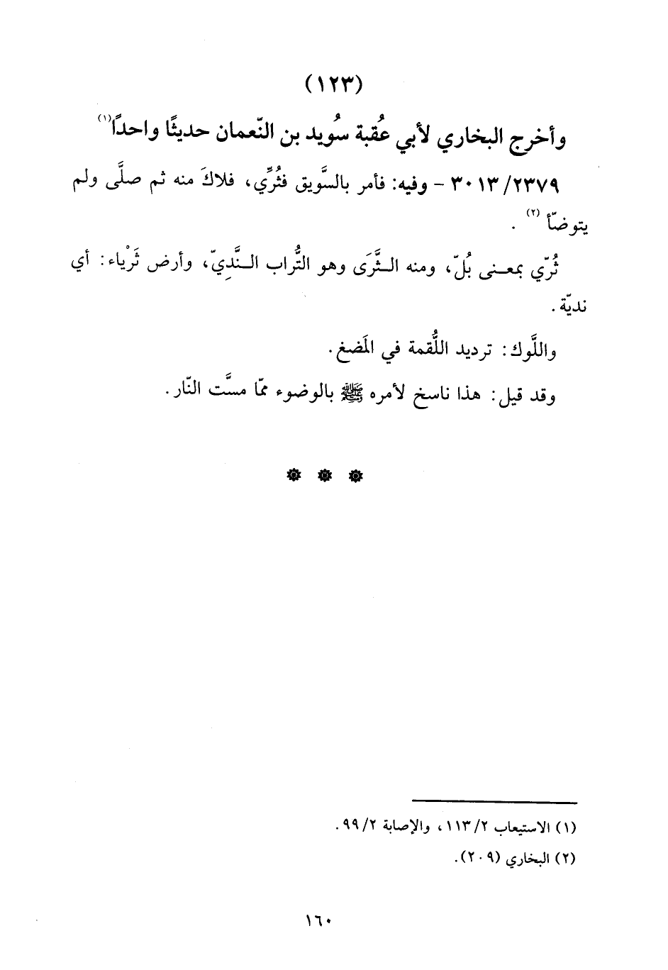 (123) وَأخرج البُخَارِيّ لأبي عقبَة سُوَيْد بن النُّعْمَان حَدِيثا وَاحِدًا