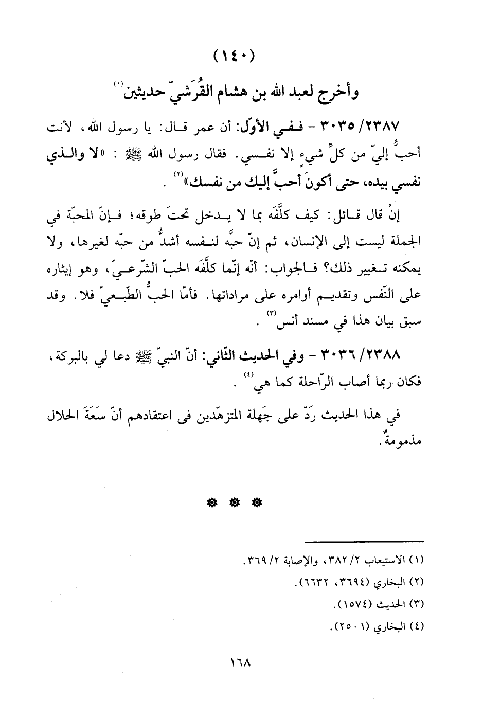 2387 - / 3035 - فَفِي الأول: أَن عمر قَالَ: يَا رَسُول الله، لأَنْت أحب إِلَيّ من كل شَيْء إِلَّا نَفسِي. فَقَالَ رَسُول الله صلى الله عَلَيْهِ وَسلم: " لَا وَالَّذِي نَفسِي بِيَدِهِ، حَتَّى أكون أحب إِلَيْك من نَفسك ".