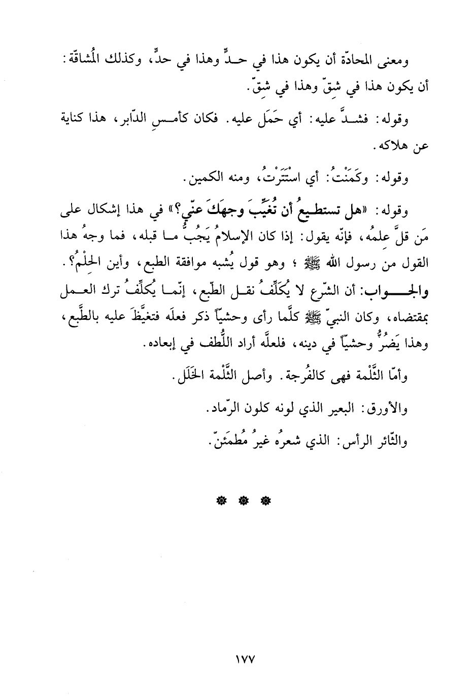 وَقَوله: " هَل تَسْتَطِيع أَن تغيب وَجهك عني؟ " فِي هَذَا إِشْكَال على من قل علمه، فَإِنَّهُ يَقُول: إِذا كَانَ الْإِسْلَام يجب مَا قبله، فَمَا وَجه هَذَا القَوْل من رَسُول الله صلى الله عَلَيْهِ وَسلم؛ وَهُوَ قَول يشبه مُوَافقَة الطَّبْع، وَأَيْنَ الْحلم؟ . وَالْجَوَاب: أَن الشَّرْع لَا يُكَلف نقل الطَّبْع، إِنَّمَا يُكَلف ترك الْعَمَل بِمُقْتَضَاهُ، وَكَانَ النَّبِي صلى الله عَلَيْهِ وَسلم كلما رأى وحشيا ذكر فعله فتغيظ عَلَيْهِ بالطبع، وَهَذَا يضر وحشيا فِي دينه، فَلَعَلَّهُ أَرَادَ اللطف فِي إبعاده.