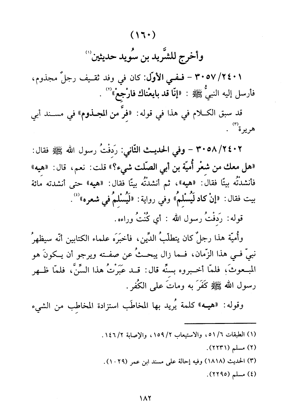 2402 - / 3058 - وَفِي الحَدِيث الثَّانِي: ردفت رَسُول الله صلى الله عَلَيْهِ وَسلم فَقَالَ: " هَل مَعَك من شعر أُميَّة بن أبي الصَّلْت شَيْء؟ " قلت: نعم، قَالَ: " هيه " فَأَنْشَدته بَيْتا فَقَالَ: " هيه "، ثمَّ أنشدته بَيْتا فَقَالَ: " هيه " حَتَّى أنشدته مائَة بَيت فَقَالَ: " إِن كَاد ليسلم " وَفِي رِوَايَة: " ليسلم فِي شعره ".