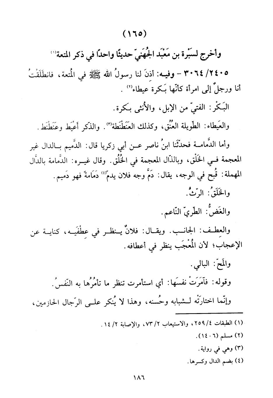 (165) وَأخرج لسبرة بن معبد الْجُهَنِيّ حَدِيثا وَاحِدًا فِي ذكر الْمُتْعَة