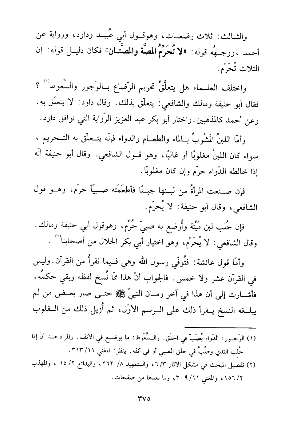 فَإِن حلب لبن ميتَة وأرضع بِهِ صبي حرم، وَهُوَ قَول أبي حنيفَة وَمَالك. وَقَالَ الشَّافِعِي: لَا يحرم، وَهُوَ اخْتِيَار أبي بكر الْخلال من أَصْحَابنَا. وَأما قَول عَائِشَة: فَتوفي رَسُول الله وَهِي فِيمَا نَقْرَأ من الْقُرْآن. وَلَيْسَ فِي الْقُرْآن عشر وَلَا خمس. فَالْجَوَاب أَن هَذَا مِمَّا نسخ لَفظه وَبَقِي حكمه فَأَشَارَتْ إِلَى أَن هَذَا فِي آخر زمَان النَّبِي صلى الله عَلَيْهِ وَسلم حَتَّى صَار بعض من لم يبلغهُ النّسخ يقْرَأ ذَلِك على الرَّسْم الأول، ثمَّ أزيل ذَلِك من الْقُلُوب