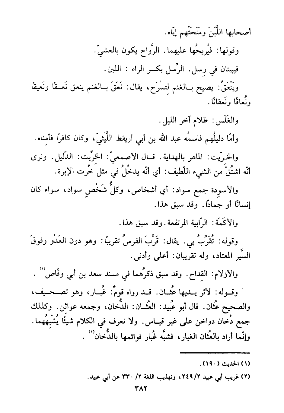 وَقَوله: لأثر يَديهَا عثان. قد رَوَاهُ قوم: غُبَار، وَهُوَ تَصْحِيف، وَالصَّحِيح عثان. قَالَ أَبُو عبيد: العثان: الدُّخان، وَجمعه عواثن. وَكَذَلِكَ جمع دُخان دواخن على غير قِيَاس. وَلَا نَعْرِف فِي الْكَلَام شَيْئا يشبههما. وَإِنَّمَا أَرَادَ بالعثان الْغُبَار، فَشبه غُبَار قَوَائِمهَا بالدخان.