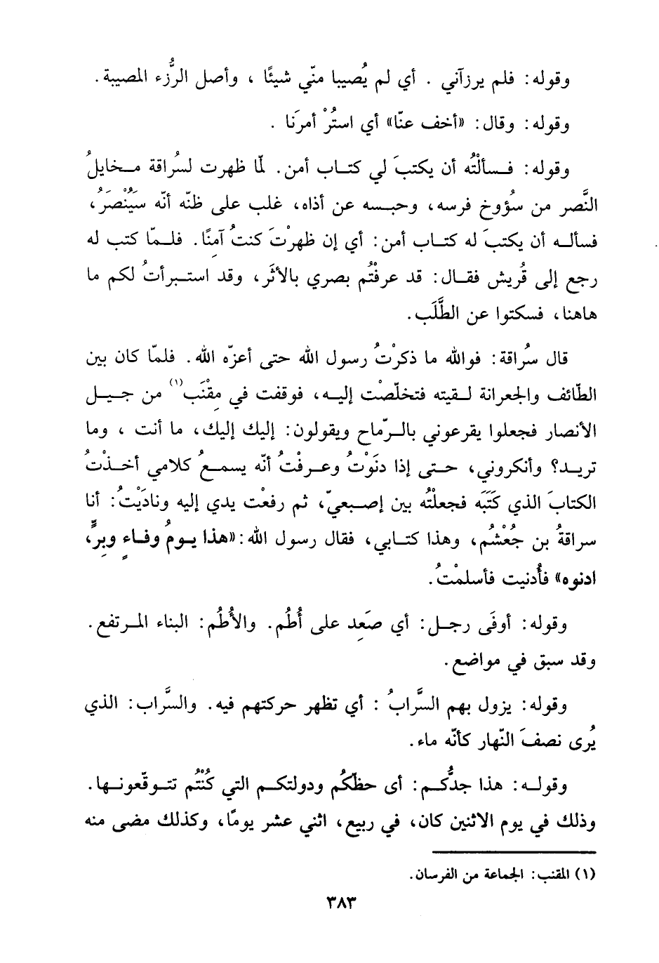 قَالَ سراقَة: فوَاللَّه مَا ذكرت رَسُول الله حَتَّى أعزه الله. فَلَمَّا كَانَ بَين الطَّائِف والجعرانة لَقيته فتخلصت إِلَيْهِ، فوقفت فِي مقنب من جيل الْأَنْصَار فَجعلُوا يقرعوني بِالرِّمَاحِ وَيَقُولُونَ: إِلَيْك إِلَيْك، مَا أَنْت، وَمَا تُرِيدُ؟ وأنكروني، حَتَّى إِذا دَنَوْت وَعرفت أَنه يسمع كَلَامي أخذت الْكتاب الَّذِي كتبه فَجَعَلته بَين إصبعي، ثمَّ رفعت يَدي إِلَيْهِ وناديت: أَنا سراقَة بن جعْشم، وَهَذَا كتابي، فَقَالَ رَسُول الله: " هَذَا يَوْم وَفَاء وبر، ادنوه " فأدنيت فَأسْلمت.