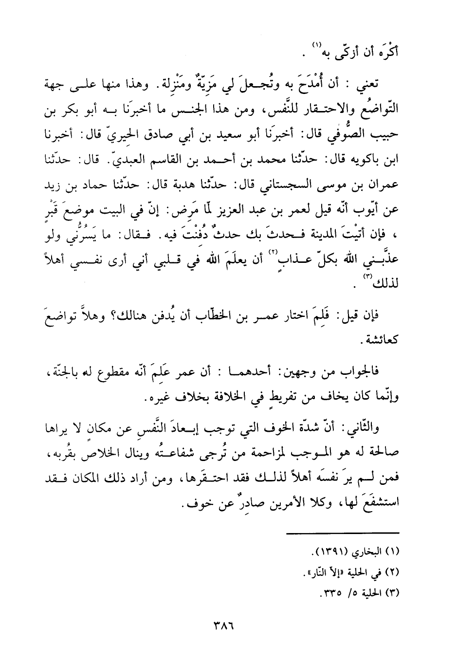 تَعْنِي: أَن أمدح بِهِ وَتجْعَل لي مزية ومنزلة. وَهَذَا مِنْهَا على جِهَة التَّوَاضُع والاحتقار للنَّفس، وَمن هَذَا الْجِنْس مَا أخبرنَا بِهِ أَبُو بكر بن حبيب الصُّوفِي قَالَ: أخبرنَا أَبُو سعيد بن أبي صَادِق الْحِيرِي قَالَ: أخبرنَا ابْن باكويه قَالَ: حَدثنَا مُحَمَّد بن أَحْمد بن الْقَاسِم الْعَبْدي. قَالَ: حَدثنَا عمرَان بن مُوسَى السجسْتانِي قَالَ: حَدثنَا هدبة قَالَ: حَدثنَا حَمَّاد بن زيد عَن أَيُّوب أَنه قيل لعمر بن عبد الْعَزِيز لما مرض: إِن فِي الْبَيْت مَوضِع قبر، فَإِن أتيت الْمَدِينَة فَحدث بك حدث دفنت فِيهِ. فَقَالَ: مَا يسرني وَلَو عذبني الله بِكُل عَذَاب أَن يعلم الله فِي قلبِي أَنِّي أرى نَفسِي أَهلا لذَلِك.
