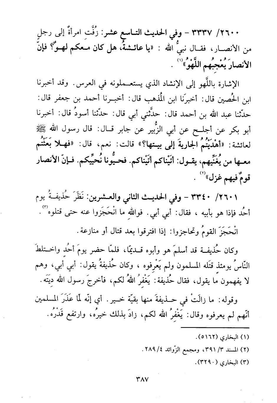 2600 - / 3337 - وَفِي الحَدِيث التَّاسِع عشر: زفت امْرَأَة إِلَى رجل من الْأَنْصَار، فَقَالَ نَبِي الله: " يَا عَائِشَة هَل كَانَ مَعكُمْ لَهو؟ فَإِن الْأَنْصَار يعجبهم اللَّهْو ".