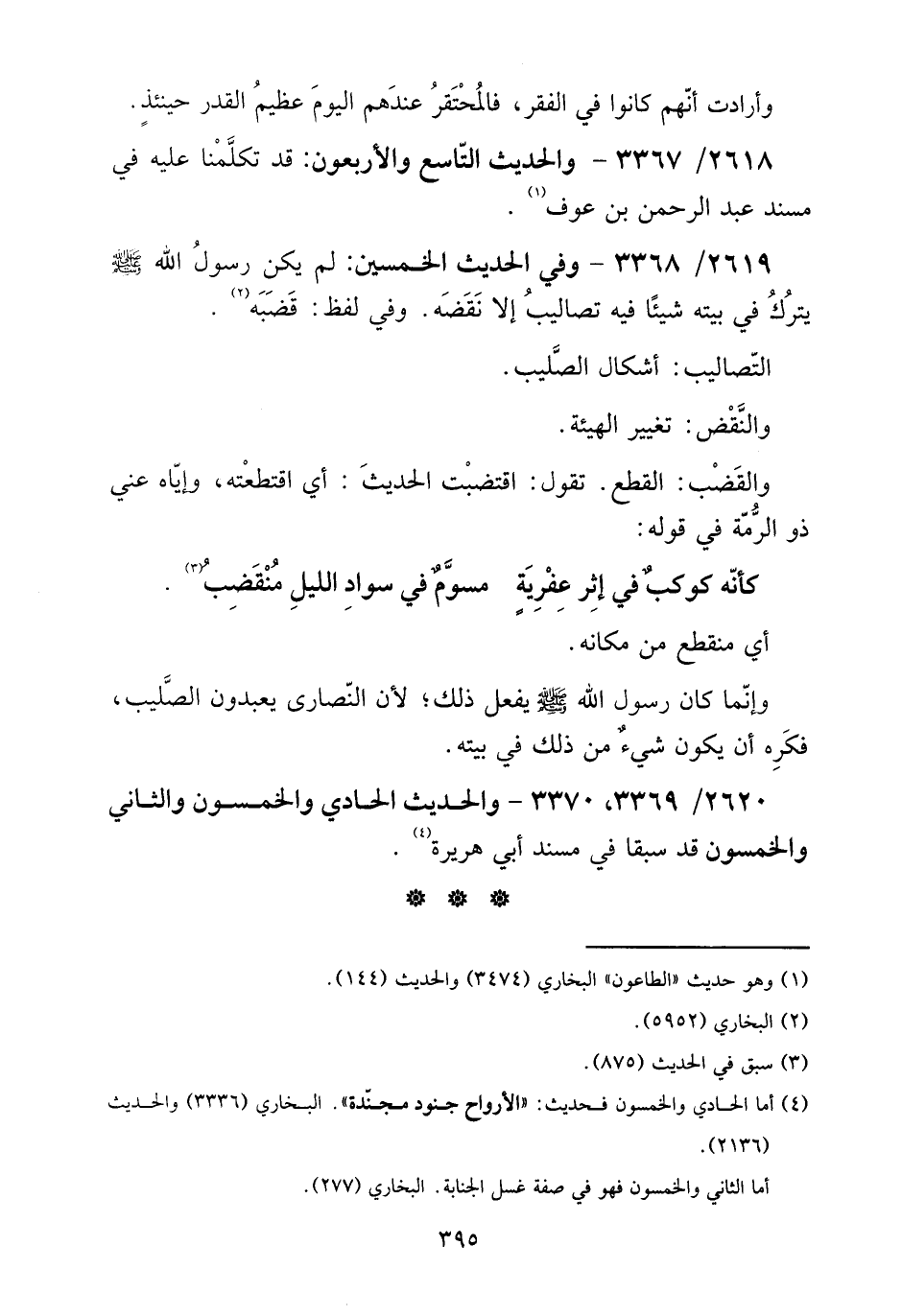 2619 - / 3368 - وَفِي الحَدِيث الْخمسين: لم يكن رَسُول الله صلى الله عَلَيْهِ وَسلم يتْرك فِي بَيته شَيْئا فِيهِ تصاليب إِلَّا نقضه. وَفِي لفظ: قضبه.
