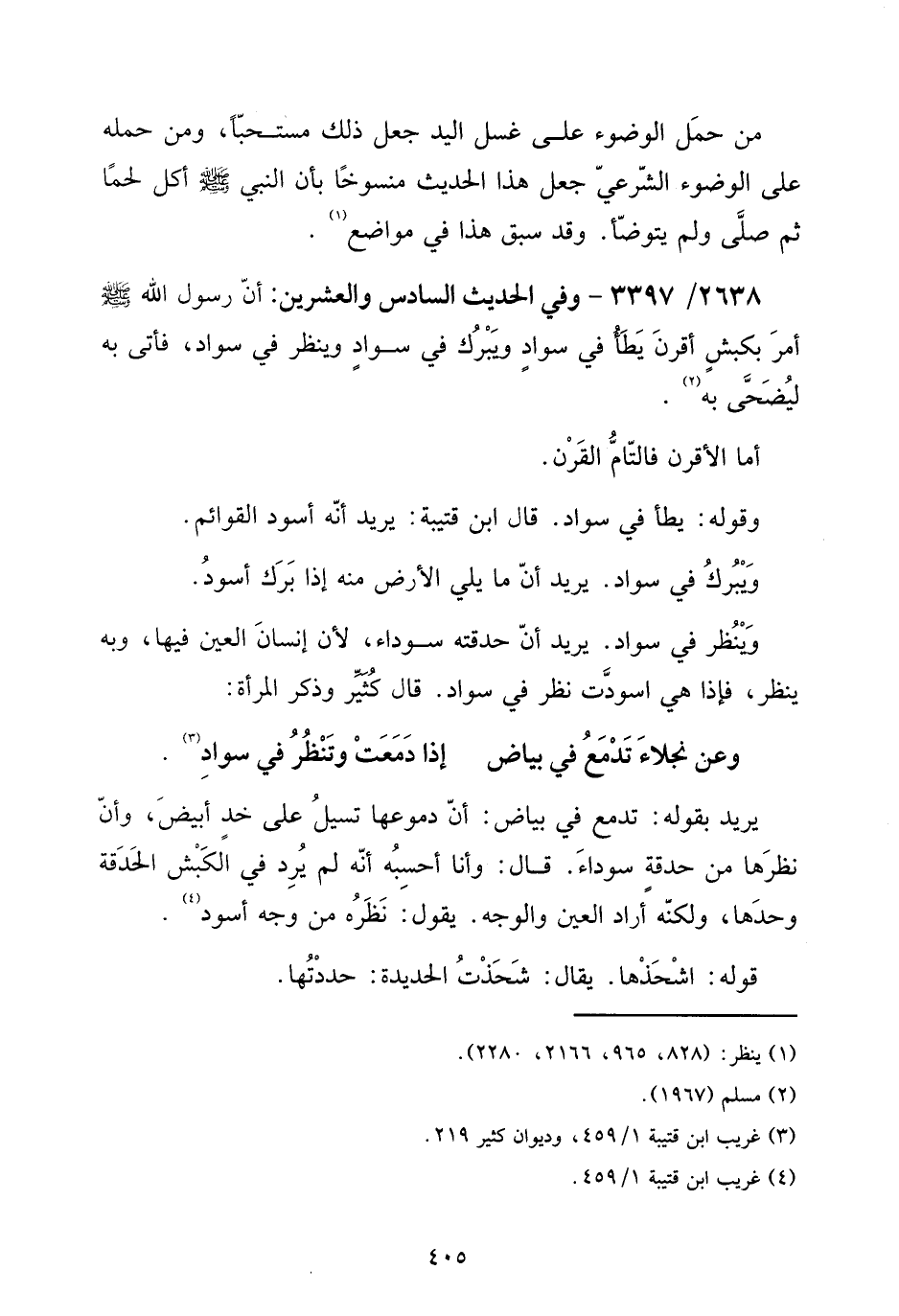 يُرِيد بقوله: تَدْمَع فِي بَيَاض: أَن دموعها تسيل على خد أَبيض، وَأَن نظرها من حدقة سَوْدَاء. قَالَ: وَأَنا أَحْسبهُ أَنه لم يرد فِي الْكَبْش الحدقة وَحدهَا، وَلكنه أَرَادَ الْعين وَالْوَجْه. يَقُول: نظره من وَجه أسود.