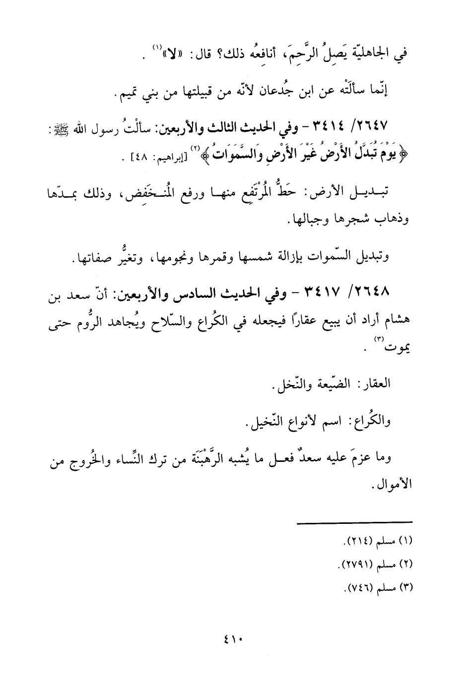 2647 - / 3414 - وَفِي الحَدِيث الثَّالِث وَالْأَرْبَعِينَ: سَأَلت رَسُول الله صلى الله عَلَيْهِ وَسلم: {يَوْم تبدل الأَرْض غير الأَرْض وَالسَّمَاوَات} [إِبْرَاهِيم: 48] .