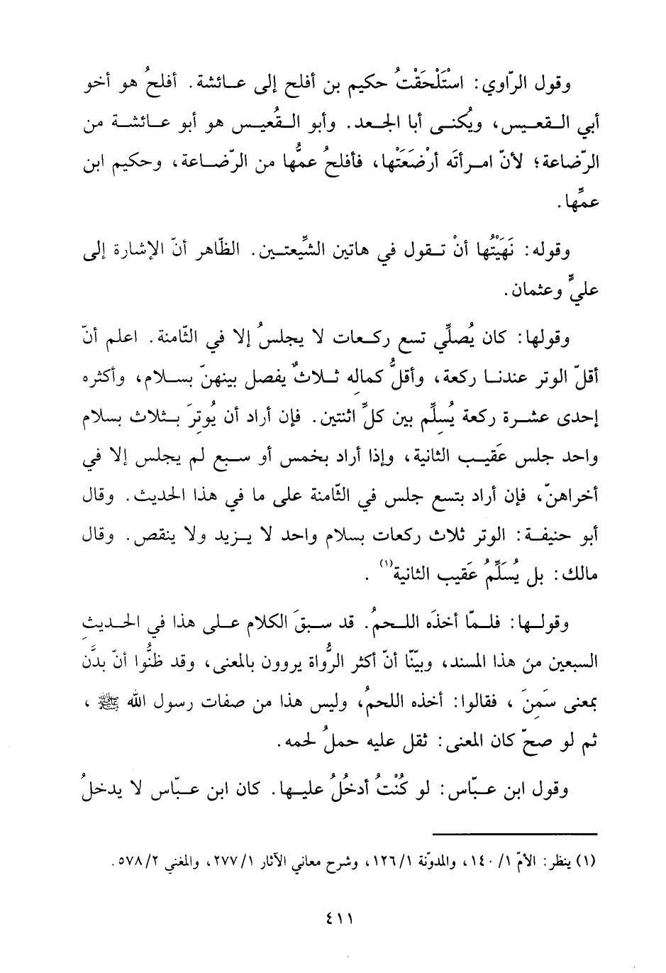 وَقَوْلها: كَانَ يُصَلِّي تسع رَكْعَات لَا يجلس إِلَّا فِي الثَّامِنَة. اعْلَم أَن أقل الْوتر عندنَا رَكْعَة، وَأَقل كَمَاله ثَلَاث يفصل بَينهُنَّ بِسَلام، وَأَكْثَره إِحْدَى عشرَة رَكْعَة يسلم بَين كل اثْنَتَيْنِ. فَإِن أَرَادَ أَن يُوتر بِثَلَاث بِسَلام وَاحِد جلس عقيب الثَّانِيَة، وَإِذا أَرَادَ بِخمْس أَو سبع لم يجلس إِلَّا فِي أخراهن، فَإِن أَرَادَ بتسع جلس فِي الثَّامِنَة على مَا فِي هَذَا الحَدِيث. وَقَالَ أَبُو حنيفَة: الْوتر ثَلَاث رَكْعَات بِسَلام وَاحِد لَا يزِيد وَلَا ينقص. وَقَالَ مَالك: بل يسلم عقيب الثَّانِيَة.