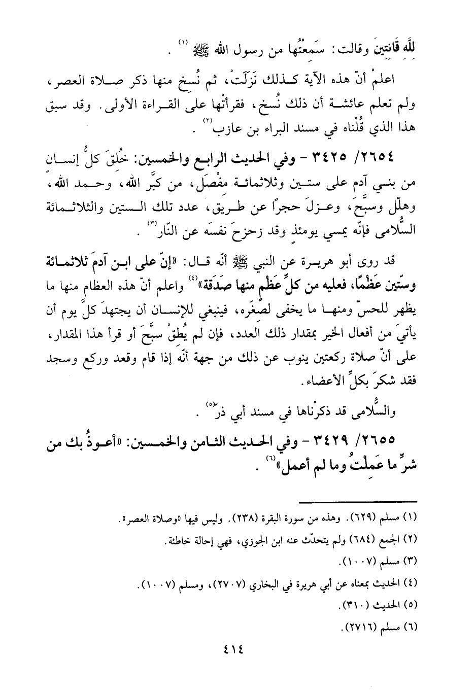 2654 - / 3425 - وَفِي الحَدِيث الرَّابِع وَالْخمسين: خلقه كل إِنْسَان من بني آدم على سِتِّينَ وثلاثمائة مفصل، من كبر الله، وَحمد الله، وَهَلل وَسبح، وعزل حجرا عَن طَرِيق، عدد تِلْكَ السِّتين والثلاثمائة السلامى فَإِنَّهُ يُمْسِي يَوْمئِذٍ وَقد زحزح نَفسه عَن النَّار.