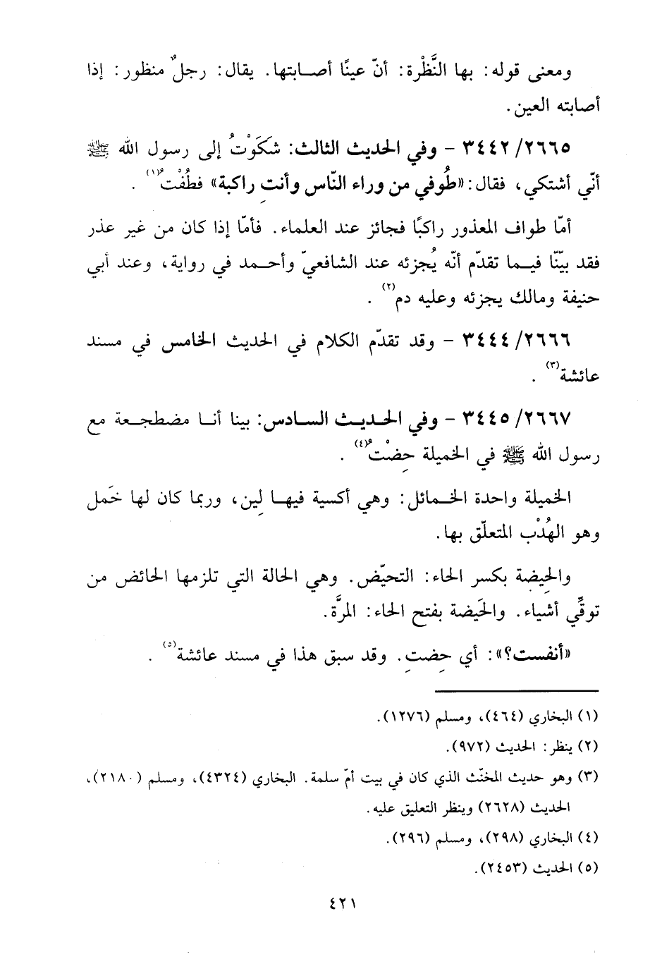 2667 - / 3445 - وَفِي الحَدِيث السَّادِس: بَينا أَنا مُضْطَجِعَة مَعَ رَسُول الله صلى الله عَلَيْهِ وَسلم فِي الخميلة حِضْت.