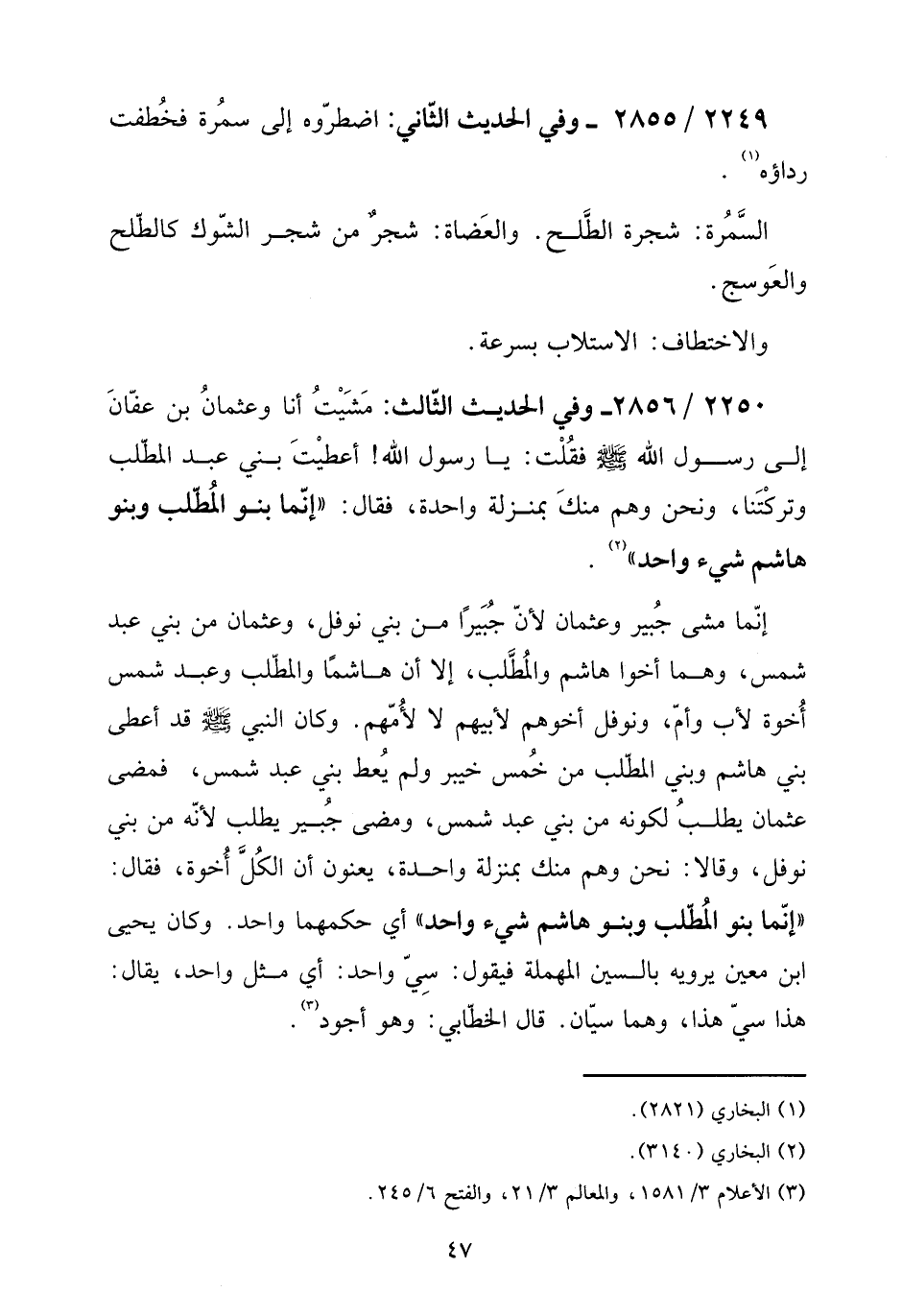 2250 - / 2856 - وَفِي الحَدِيث الثَّالِث: مشيت أَنا وَعُثْمَان بن عَفَّان إِلَى رَسُول الله صلى الله عَلَيْهِ وَسلم فَقلت: يَا رَسُول الله! أَعْطَيْت بني عبد الْمطلب وَتَرَكتنَا، وَنحن وهم مِنْك بِمَنْزِلَة وَاحِدَة، فَقَالَ: " إِنَّمَا بَنو الْمطلب وَبَنُو هَاشم شَيْء وَاحِد ".