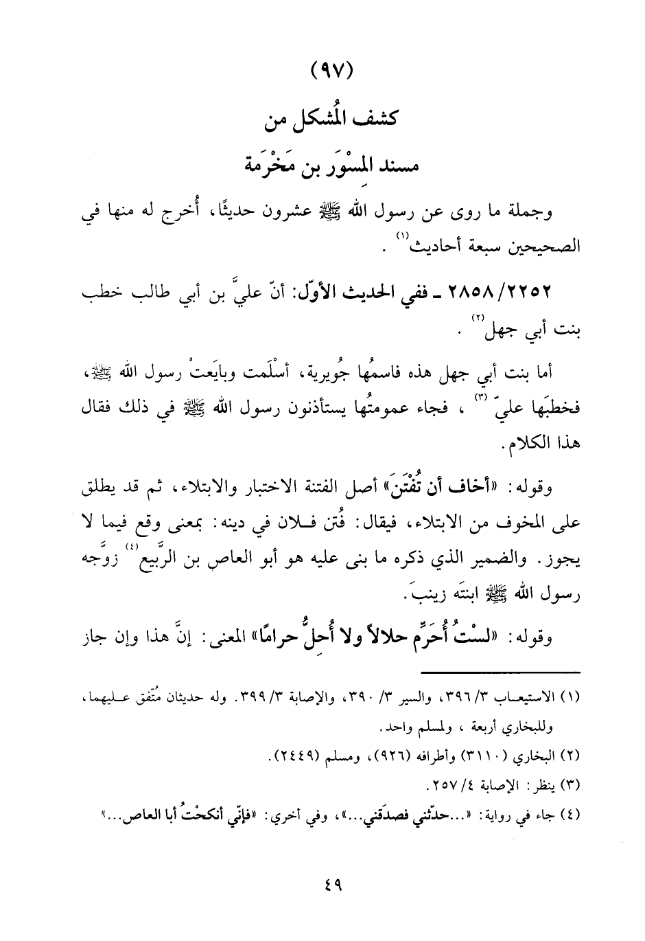 2252 - / 2858 - فَفِي الحَدِيث الأول: أَن عَليّ بن أبي طَالب خطب بنت أبي جهل.