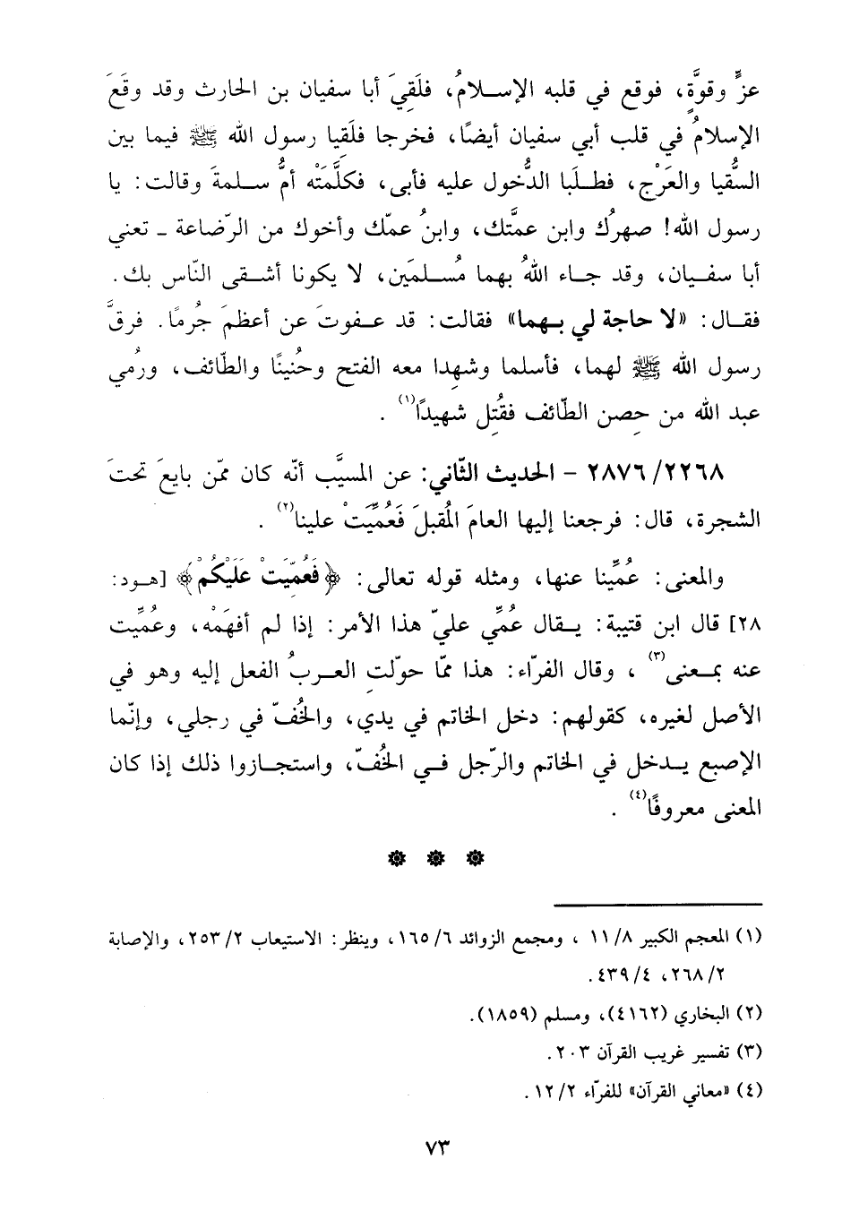 عز وَقُوَّة، فَوَقع فِي قلبه الْإِسْلَام، فلقي أَبَا سُفْيَان بن الْحَارِث وَقد وَقع الْإِسْلَام فِي قلب أبي سُفْيَان أَيْضا، فَخَرَجَا فلقيا رَسُول الله صلى الله عَلَيْهِ وَسلم فِيمَا بَين السقيا وَالْعَرج، فطلبا الدُّخُول عَلَيْهِ فَأبى، فكلمته أم سَلمَة وَقَالَت: يَا رَسُول الله! صهرك وَابْن عَمَّتك، وَابْن عمك وأخوك من الرضَاعَة - تَعْنِي أَبَا سُفْيَان، وَقد جَاءَ الله بهما مُسلمين، لَا يَكُونَا أَشْقَى النَّاس بك. فَقَالَ: " لَا حَاجَة لي بهما " فَقَالَت: قد عَفَوْت عَن أعظم جرما. فرق رَسُول الله صلى الله عَلَيْهِ وَسلم لَهما، فَأَسْلمَا وشهدا مَعَه الْفَتْح وحنينا والطائف، وَرمي عبد الله من حصن الطَّائِف فَقتل شَهِيدا.