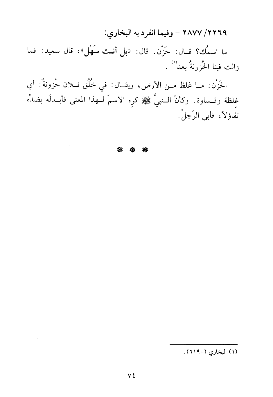 الْحزن: مَا غلظ من الأَرْض، وَيُقَال: فِي خلق فلَان حزونة: أَي غلظة وقساوة. وَكَأن النَّبِي صلى الله عَلَيْهِ وَسلم كره الِاسْم لهَذَا الْمَعْنى فأبدله بضده تفاؤلا، فَأبى الرجل.