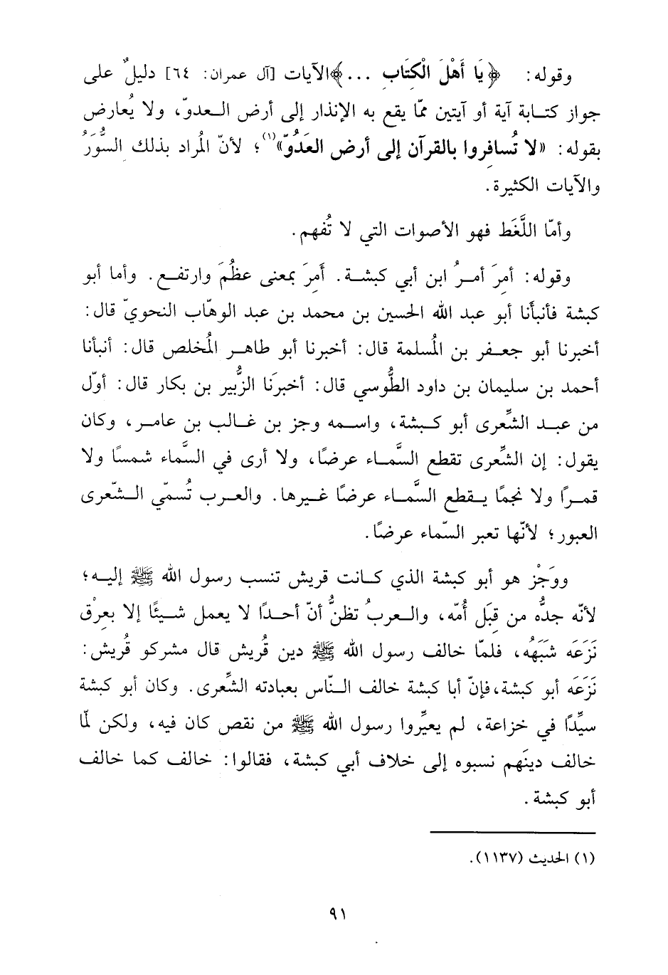 وَقَوله: أَمر أَمر ابْن أبي كَبْشَة. أَمر بِمَعْنى عظم وارتفع. وَأما أَبُو كَبْشَة فأنبأنا أَبُو عبد الله الْحُسَيْن بن مُحَمَّد بن عبد الْوَهَّاب النَّحْوِيّ قَالَ: أخبرنَا أَبُو جَعْفَر بن الْمسلمَة قَالَ: أخبرنَا أَبُو طَاهِر المخلص قَالَ: أَنبأَنَا أَحْمد بن سُلَيْمَان بن دَاوُد الطوسي قَالَ: أخبرنَا الزبير بن بكار قَالَ: أول من عبد الشعرى أَبُو كَبْشَة، واسْمه وجز بن غَالب بن عَامر، وَكَانَ يَقُول: إِن الشعرى تقطع السَّمَاء عرضا، وَلَا أرى فِي السَّمَاء شمسا وَلَا قمرا وَلَا نجما يقطع السَّمَاء عرضا غَيرهَا. وَالْعرب تسمي الشعرى العبور؛ لِأَنَّهَا تعبر السَّمَاء عرضا.