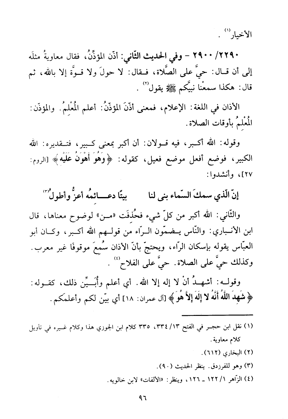 وَالثَّانِي: الله أكبر من كل شَيْء فحذفت " من " لوضوح مَعْنَاهَا، قَالَ ابْن الْأَنْبَارِي: وَالنَّاس يضمون الرَّاء من قَوْلهم الله أكبر، وَكَانَ أَبُو الْعَبَّاس يَقُوله بِإِسْكَان الرَّاء، ويحتج بِأَن الْأَذَان سمع مَوْقُوفا غير مُعرب. وَكَذَلِكَ حَيّ على الصَّلَاة. حَيّ على الْفَلاح.