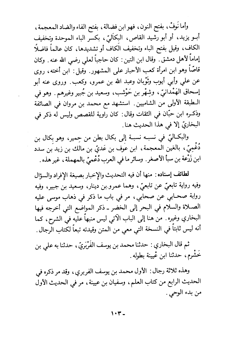 وأما نَوفْ، بفتح النون، فهو ابن فضالة، بفتح الفاء والضاد المعجمة، أبو يزيد، أو أبو رشيد القاص، البِكاليّ، بكسر الباء الموحدة وتخفيف الكاف، وقيل بفتح الباء وتخفيف الكاف أو تشديدها، كان عالمًا فاضلًا إمامًا لأهل دمشق. وقال ابن التين: كان حاجبًا لعلي رضي الله عنه. وكان قاصًّا وهو وابن امرأة كعب الأحبار على المشهور. وقيل: ابن أخته، روى عن علي وأبي أيوب وثَوْبان وعبد الله بن عمرو، وكعب. وروى عنه أبو إسحاق الهَمْدانيّ، وشِهْر بن حَوْشب، وسعيد بن جُبير وغيرهم. وهو في الطبقة الأولى من الشاميين. استشهد مع محمد بن مروان في الصائفة وذكره ابن حبّان في الثقات وقال: كان راوية للقصص وليس له ذكر في البخاريّ إلا في هذا الحديث هنا.