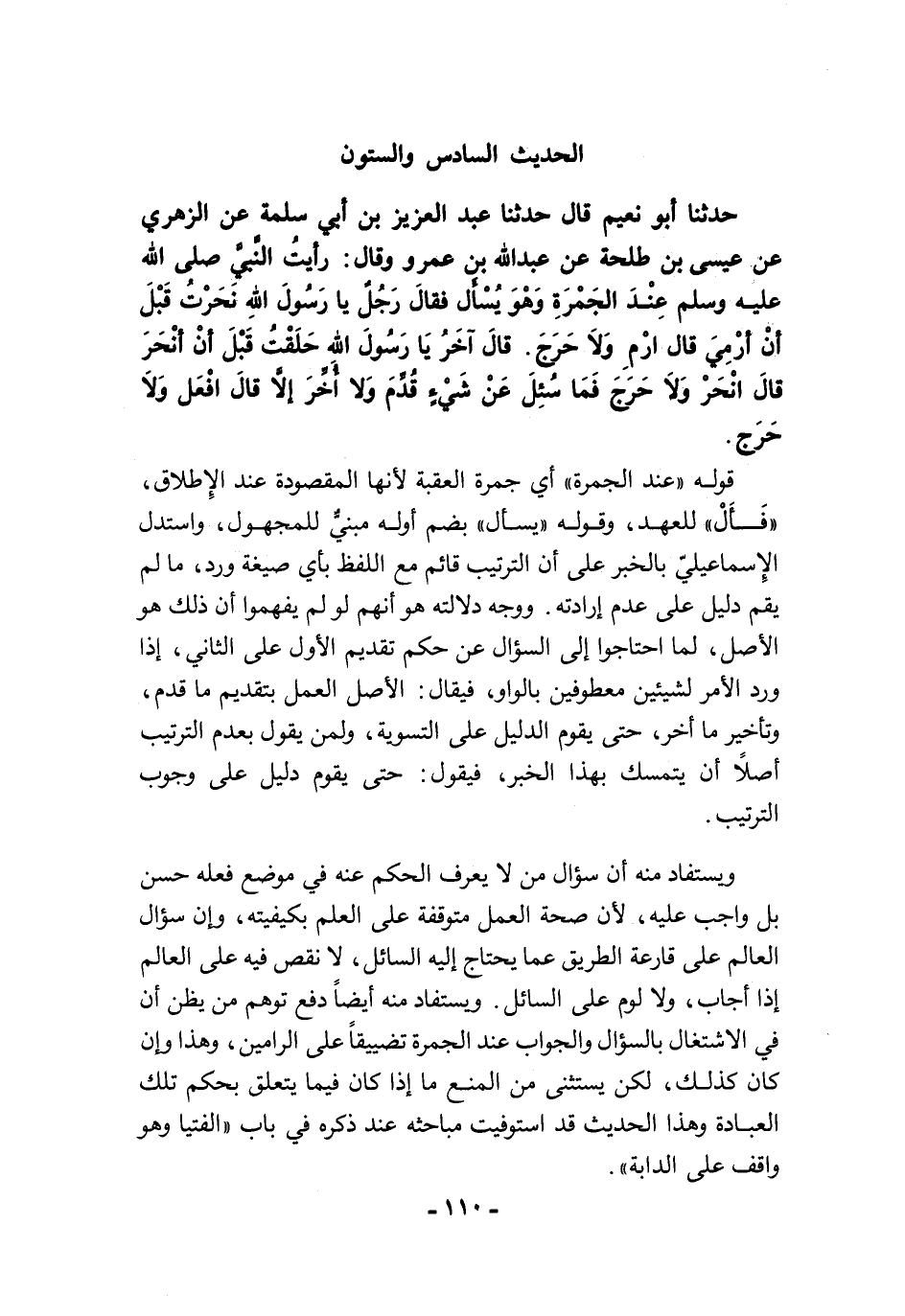 قوله "عند الجمرة" أي جمرة العقبة لأنها المقصودة عند الإطلاق، "فَأَلْ" للعهد، وقوله "يسأل" بضم أوله مبنيٌّ للمجهول، واستدل الإسماعيليّ بالخبر على أن الترتيب قائم مع اللفظ بأي صيغة ورد، ما لم يقم دليل على عدم إرادته. ووجه دلالته هو أنهم لو لم يفهموا أن ذلك هو الأصل، لما احتاجوا إلى السؤال عن حكم تقديم الأول على الثاني، إذا ورد الأمر لشيئين معطوفين بالواو، فيقال: الأصل العمل بتقديم ما قدم، وتأخير ما أخر، حتى يقوم الدليل على التسوية، ولمن يقول بعدم الترتيب أصلًا أن يتمسك بهذا الخبر، فيقول: حتى يقوم دليل على وجوب الترتيب.