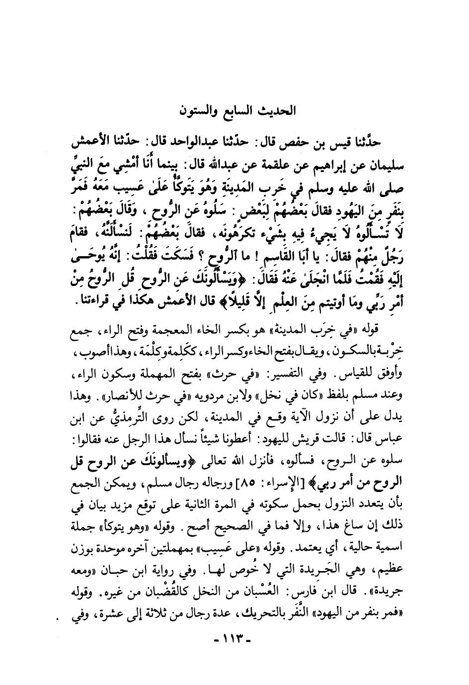 حَدَّثَنَا قَيْسُ بْنُ حَفْصٍ قَالَ: حَدَّثَنَا عَبْدُ الْوَاحِدِ قَالَ: حَدَّثَنَا الأَعْمَشُ سُلَيْمَانُ عَنْ إِبْرَاهِيمَ عَنْ عَلْقَمَةَ عَنْ عَبْدِ اللَّهِ قَالَ: بَيْنَمَا أَنَا أَمْشِى مَعَ النَّبِيِّ -صلى الله عليه وسلم- فِي خَرِبِ الْمَدِينَةِ، وَهُوَ يَتَوَكَّأُ عَلَى عَسِيبٍ مَعَهُ، فَمَرَّ بِنَفَرٍ مِنَ الْيَهُودِ، فَقَالَ بَعْضُهُمْ لِبَعْضٍ: سَلُوهُ عَنِ الرُّوحِ. وَقَالَ بَعْضُهُمْ: لاَ تَسْأَلُوهُ لاَ يَجِيءُ فِيهِ بِشَيْءٍ تَكْرَهُونَهُ. فَقَالَ بَعْضُهُمْ: لَنَسْأَلَنَّهُ. فَقَامَ رَجُلٌ مِنْهُمْ فَقَالَ: يَا أَبَا الْقَاسِمِ! مَا الرُّوحُ؟ فَسَكَتَ. فَقُلْتُ: إِنَّهُ يُوحَى إِلَيْهِ. فَقُمْتُ، فَلَمَّا انْجَلَى عَنْهُ، قَالَ {وَيَسْأَلُونَكَ عَنِ الرُّوحِ قُلِ الرُّوحُ مِنْ أَمْرِ رَبِّي وَمَا أُوتِيتُمْ مِنَ الْعِلْمِ إِلَّا قَلِيلًا}. قَالَ الأَعْمَشُ هَكَذَا فِى قِرَاءَتِنَا.