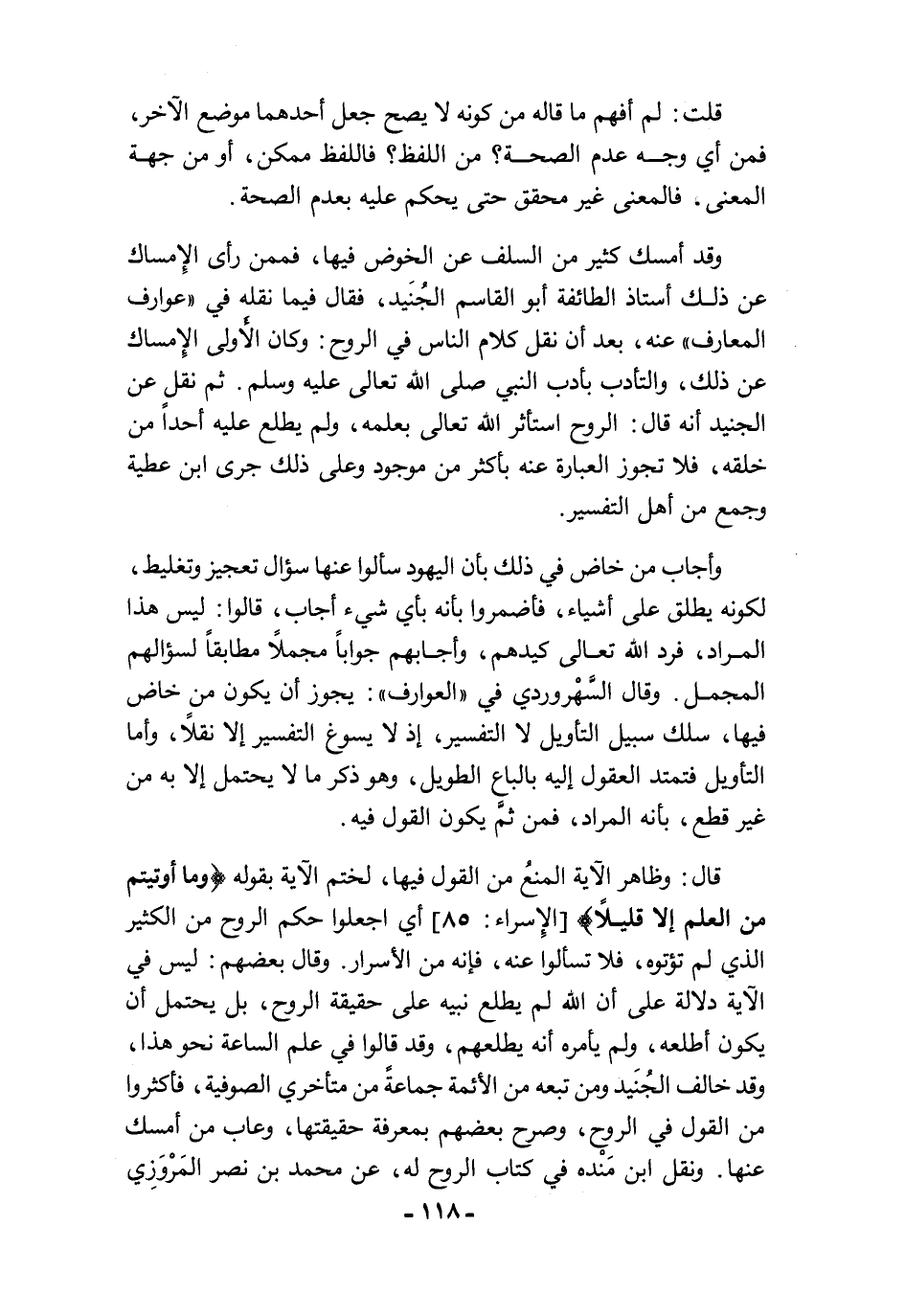 وقد أمسك كثير من السلف عن الخوض فيها، فممن رأى الإمساك عن ذلك أستاذ الطائفة أبو القاسم الجُنَيد، فقال فيما نقله في "عوارف المعارف" عنه، بعد أن نقل كلام الناس في الروح: وكان الأولى الإمساك عن ذلك، والتأدب بادب النبي صلى الله تعالى عليه وسلم. ثم نقل عن الجنيد أنه قال: الروح استأثر الله تعالى بعلمه، ولم يطلع عليه أحداً من خلقه، فلا تجوز العبارة عنه بأكثر من موجود وعلى ذلك جرى ابن عطية وجمع من أهل التفسير.