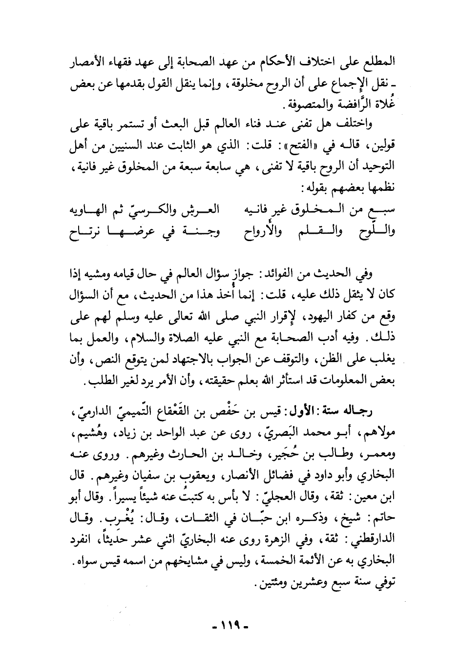 واختلف هل تفنى عند فناء العالم قبل البعث أو تستمر باقية على قولين، قاله في "الفتح": قلت: الذي هو الثابت عند السنيين من أهل التوحيد أن الروح باقية لا تفنى، هي سابعة سبعة من المخلوق غير فانية، نظمها بعضهم بقوله:
