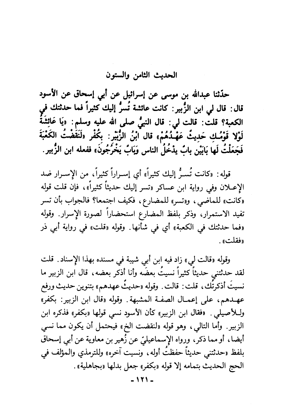 حَدَّثَنَا عُبَيْدُ اللَّهِ بْنُ مُوسَى عَنْ إِسْرَائِيلَ عَنْ أَبِي إِسْحَاقَ عَنِ الأَسْوَدِ قَالَ: قَالَ لِي ابْنُ الزُّبَيْرِ: كَانَتْ عَائِشَةُ تُسِرُّ إِلَيْكَ كَثِيرًا فَمَا حَدَّثَتْكَ فِى الْكَعْبَةِ؟ قُلْتُ: قَالَتْ لِي: قَالَ النَّبِيُّ -صلى الله عليه وسلم-: "يَا عَائِشَةُ، لَوْلاَ قَوْمُكِ حَدِيثٌ عَهْدُهُمْ" قَالَ ابْنُ الزُّبَيْرِ: بِكُفْرٍ "لَنَقَضْتُ الْكَعْبَةَ فَجَعَلْتُ لَهَا بَابَيْنِ بَابٌ يَدْخُلُ النَّاسُ، وَبَابٌ يَخْرُجُونَ". فَفَعَلَهُ ابْنُ الزُّبَيْرِ.