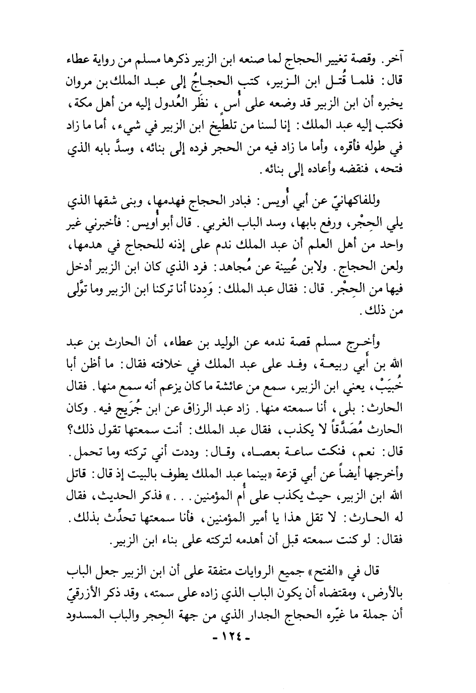 آخر. وقصة تغيير الحجاج لما صنعه ابن الزبير ذكرها مسلم من رواية عطاء قال: فلما قُتل ابن الزبير، كتب الحجاجُ إلى عبد الملك بن مروان يخبره أن ابن الزبير قد وضعه على أُسٍ، نظَر العُدول إليه من أهل مكة، فكتب إليه عبد الملك: إنا لسنا من تلطيخ ابن النربير في شيء، أما ما زاد في طوله فأقره، وأما ما زاد فيه من الحجر فرده إلى بنائه، وسدَّ بابه الذي فتحه، فنقضه وأعاده إلى بنائه.