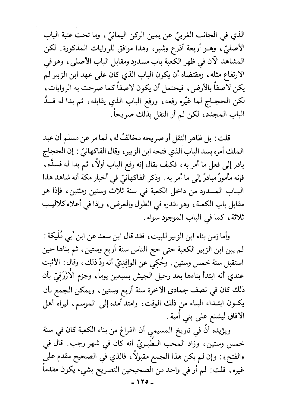 قلت: بل ظاهر النقل أو صريحه مخالفٌ له، لما مر عن مسلم أن عبد الملك أمره بسد الباب الذي فتحه ابن الزبير، وقال الفاكهانيّ: إن الحجاج بادر إلى فعل ما أمر به، فكيف يقال إنه رفع الباب أولًا، ثم بدا له فسدَّه، فإنه مأمورٌ مبادرٌ إلى ما أمر به. وذكر الفاكهانيّ في أخبار مكة أنه شاهد هذا الباب المسدود من داخل الكعبة في سنة ثلاث وستين ومئتين، فإذا هو مقابل باب الكعبة، وهو بقدره في الطول والعرض، وإذا في أعلاه كلاليب ثلاثة، كما في الباب الموجود سواء.