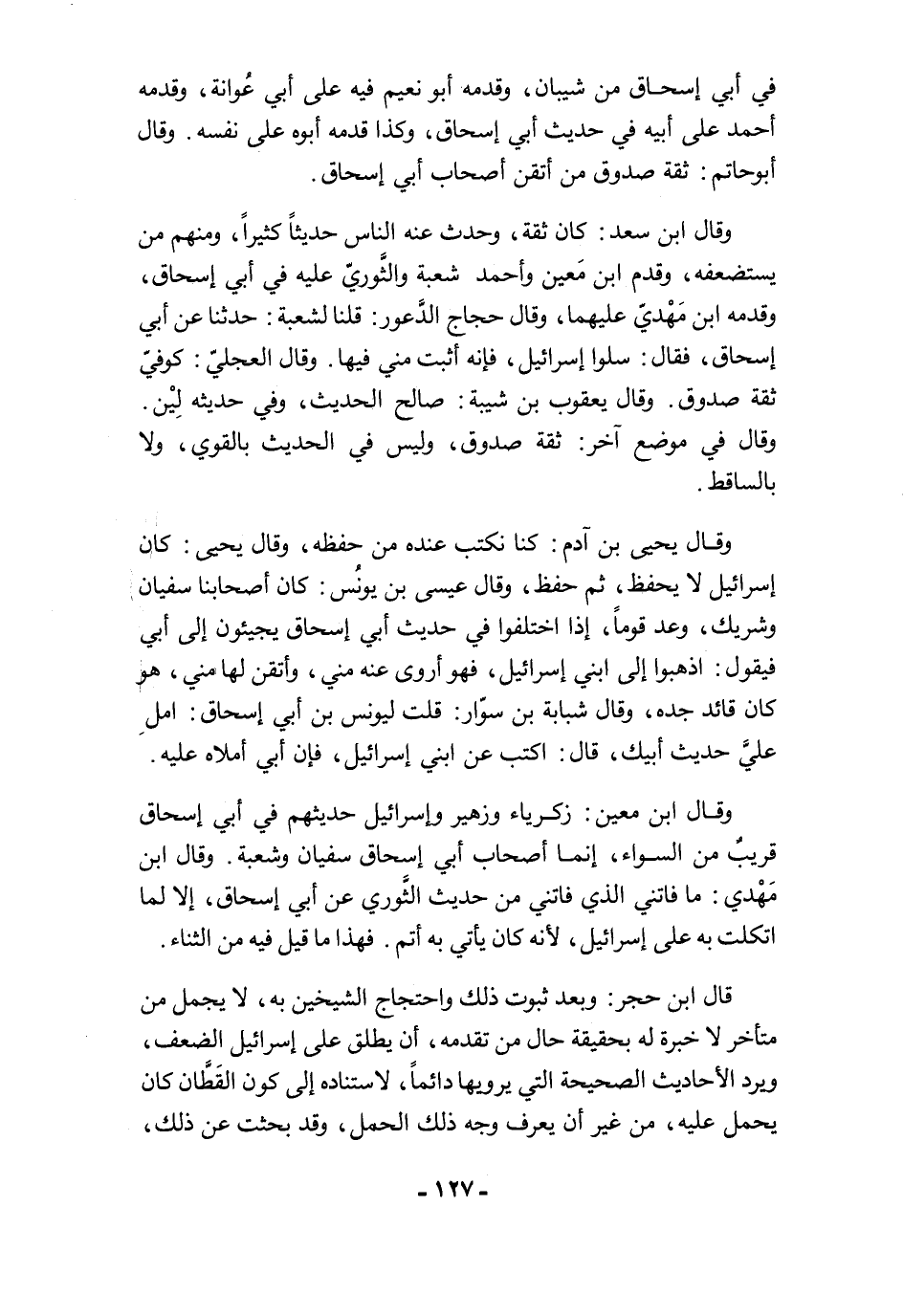 وقال ابن معين: زكرياء وزهير وإسرائيل حديثهم في أبي إسحاق قريبٌ من السواء، إنما أصحاب أبي إسحاق سفيان وشعبة. وقال ابن مَهْدي: ما فاتني الذي فاتني من حديث الثَّوري عن أبي إسحاق، إلا لما اتكلت به على إسرائيل؛ لأنه كان يأتي به أتم. فهذا ما قيل فيه من الثناء.