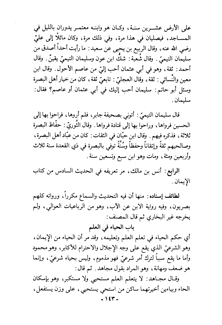 على الأرض عشرين سنة، وكان هو وابنه معتمر يدوران بالليل في المساجد، فيصليان في هذا مرة، وفي ذلك مرة، وكان مائلًا إلى عليّ رضي الله عنه، وقال الربيع بن يحيى عن سعيد: ما رأيت أحدًا أصدق من سليمان التيميّ. وقال شُعبة: شكُّ ابن عون وسليمان التيميّ يقينٌ. وقال أحمد: ثقة، وهو في أبي عثمان أحب إليّ من عاصم الأحول. وقال ابن معين والنَّسائي: ثقة، وقال العجليّ: تابعيّ ثقة، كان من خيار أهل البصرة وسئل أبو حاتم: سليمان أحب إليك في أبي عثمان أو عاصم؟ فقال: سليمان.