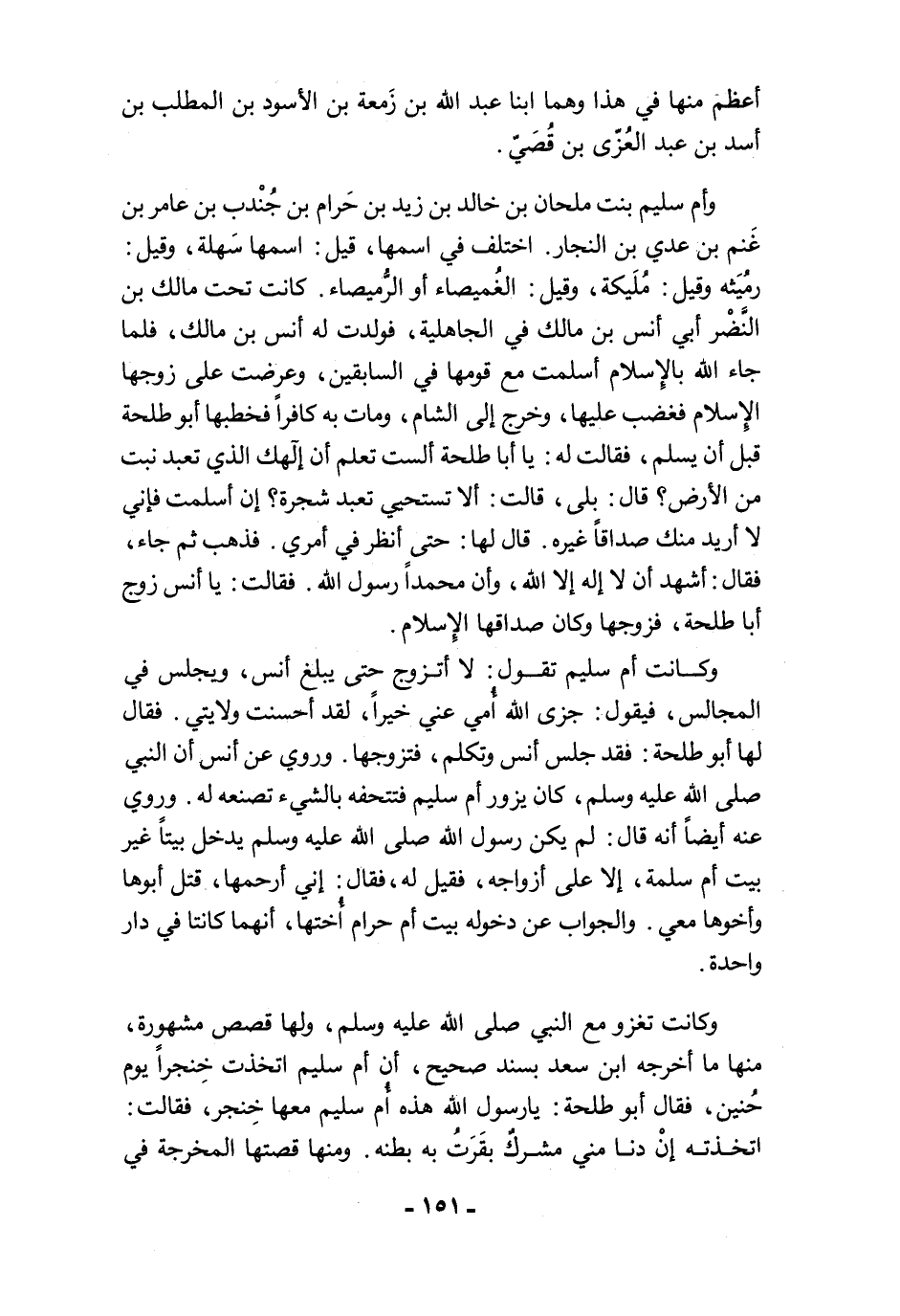 وأم سليم بنت ملحان بن خالد بن زيد بن حَرام بن جُنْدب بن عامر بن غَنم بن عدي بن النجار. اختلف في اسمها، قيل: اسمها سَهلة، وقيل: رمُيَثه وقيل: مُلَيكة، وقيل: الغُميصاء أو الرُّميصاء. كانت تحت مالك بن النَّضْر أبي أنس بن مالك في الجاهلية، فولدت له أنس بن مالك، فلما جاء الله بالإسلام أسلمت مع قومها في السابقين، وعرضت على زوجها الإِسلام فغضب عليها، وخرج إلى الشام، ومات به كافرًا فخطبها أبو طلحة قبل أن يسلم، فقالت له: يا أبا طلحة ألست تعلم أن إلهك الذي تعبد نبت من الأرض؟ قال: بلى، قالت: ألا تستحيي تعبد شجرة؟ إن أسلمت فإني لا أريد منك صداقًا غيره. قال لها: حتى انظر في أمري. فذهب ثم جاء، فقال: أشهد أن لا إله إلا الله، وأن محمدًا رسول الله. فقالت: يا أنس زوج أبا طلحة، فزوجها وكان صداقها الإِسلام.