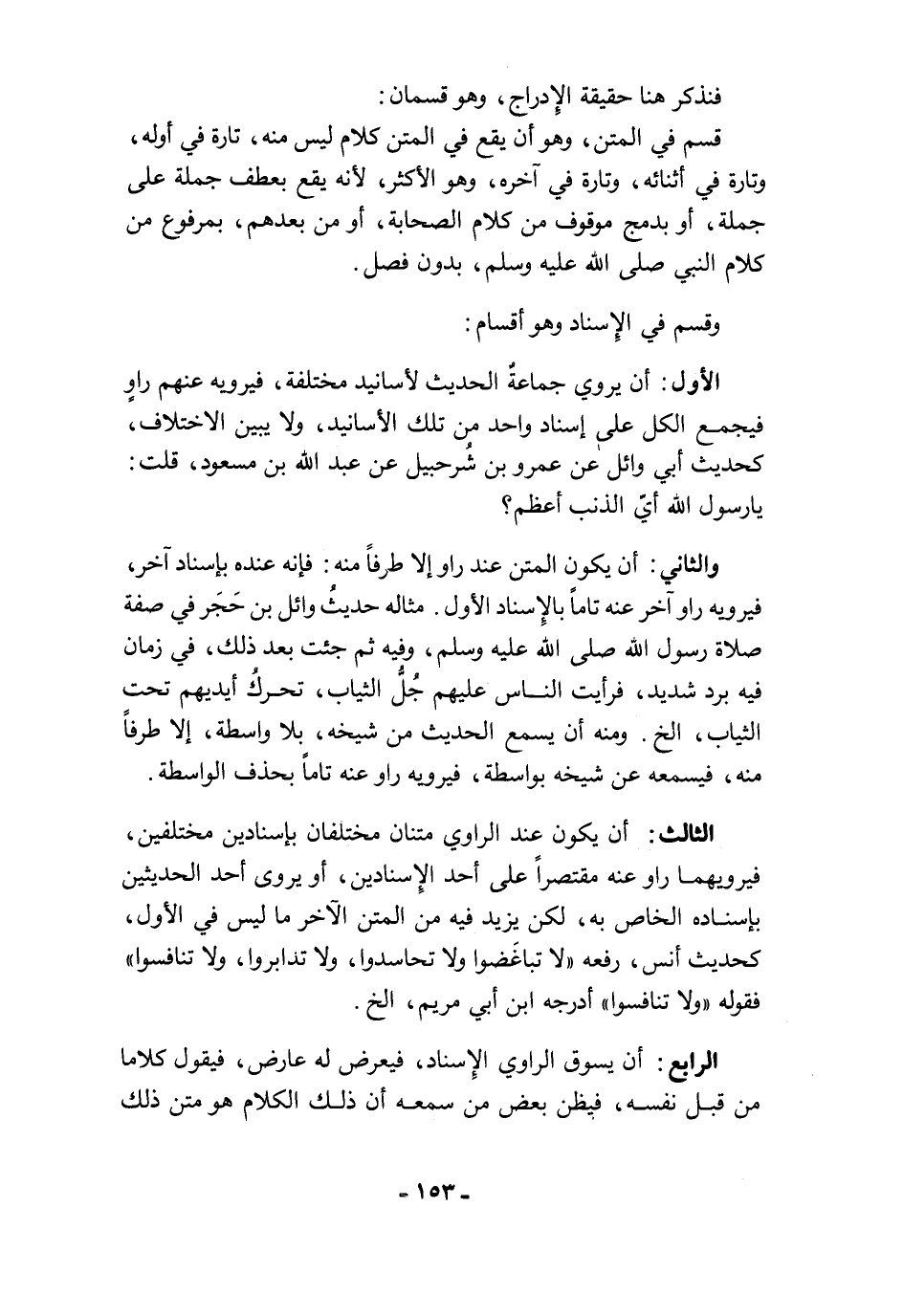 الثالث: أن يكون عند الراوي متنان مختلفان بإسنادين مختلفين، فيرويهما راو عنه مقتصرًا على أحد الإسنادين، أو يروى أحد الحديثين بإسناده الخاص به، لكن يزيد فيه من المتن الآخر ما ليس في الأول، كحديث أنس، رفعه "لا تباغَضوا ولا تحاسدوا، ولا تدابروا، ولا تنافسوا" فقدله "ولا تنافسوا" أدرجه ابن أبي مريم، الخ.