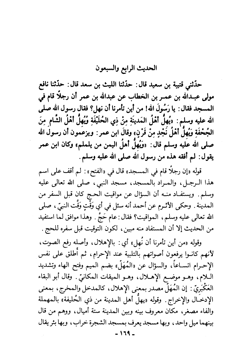 حَدَّثَنِي قُتَيْبَةُ بْنُ سَعِيدٍ قَالَ: حَدَّثَنَا اللَّيْثُ بْنُ سَعْدٍ قَالَ: حَدَّثَنَا نَافِعٌ مَوْلَى عَبْدِ اللَّهِ بْنِ عُمَرَ بْنِ الْخَطَّابِ عَنْ عَبْدِ اللَّهِ بْنِ عُمَرَ. أَنَّ رَجُلاً قَامَ فِى الْمَسْجِدِ فَقَالَ: يَا رَسُولَ اللَّهِ! مِنْ أَيْنَ تَأْمُرُنَا أَنْ نُهِلَّ فَقَالَ رَسُولُ اللَّهِ -صلى الله عليه وسلم-: "يُهِلُّ أَهْلُ الْمَدِينَةِ مِنْ ذِي الْحُلَيْفَةِ، وَيُهِلُّ أَهْلُ الشَّامِ مِنَ الْجُحْفَةِ، وَيُهِلُّ أَهْلُ نَجْدٍ مِنْ قَرْنٍ". وَقَالَ ابْنُ عُمَرَ: وَيَزْعُمُونَ أَنَّ رَسُولَ اللَّهِ -صلى الله عليه وسلم- قَالَ: "وَيُهِلُّ أَهْلُ الْيَمَنِ مِنْ يَلَمْلَمَ". وَكَانَ ابْنُ عُمَرَ يَقُولُ: لَمْ أَفْقَهْ هَذِهِ مِنْ رَسُولِ اللَّهِ -صلى الله عليه وسلم-.