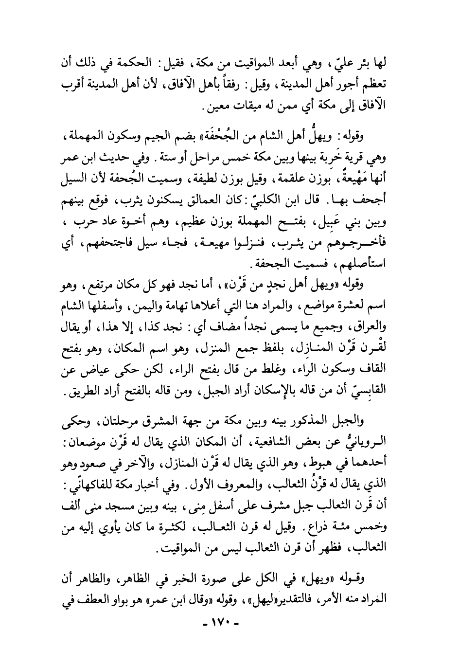 وقوله: "ويهلُّ أهل الشام من الجُحْفَة" بضم الجيم وسكون المهملة، وهي قرية خَرِبة بيتها وبين مكة خمس مراحل أو ستة. وفي حديث ابن عمر أنها مَهْيعةٌ، بوزن علقمة، وقيل بوزن لطيفة، وسميت الجُحفة لأن السيل أجحف بها. قال ابن الكلبيّ: كان العمالق يسكنون يثرب، فوقع بينهم وبين بني عَبِيل، بفتح المهملة بوزن عظيم، وهم أخوة عاد حرب، فأخرجوهم من يثرب، فنزلوا مهيعة، فجاء سيل فاجتحفهم، أي استأصلهم، فسميت الجحفة.