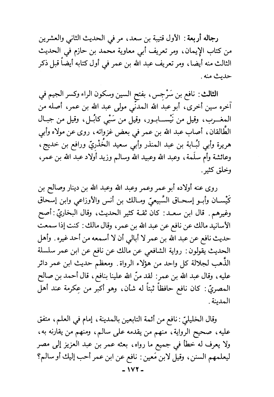 الثالث: نافع بن سَرْجِس، بفتح السين وسكون الراء وكسر الجيم في آخره سين أخرى، أبو عبد الله المدني مولى عبد الله بن عمر، أصله من المغرب، وقيل من نَيْسابور، وقيل من سَبْي كابُل، وقيل من جبال الطَّالقان، أصاب عبد الله بن عمر في بعض غزواته، روى عن مولاه وأبي هريرة وأبي لبُابة بن عبد المنذر وأبي سعيد الخُدْريّ ورافع بن خديج، وعائشة وأم سلَمة، وعبد الله وعبيد الله وسالم وزيد أولاد عبد الله بن عمر، وخلق كثير.