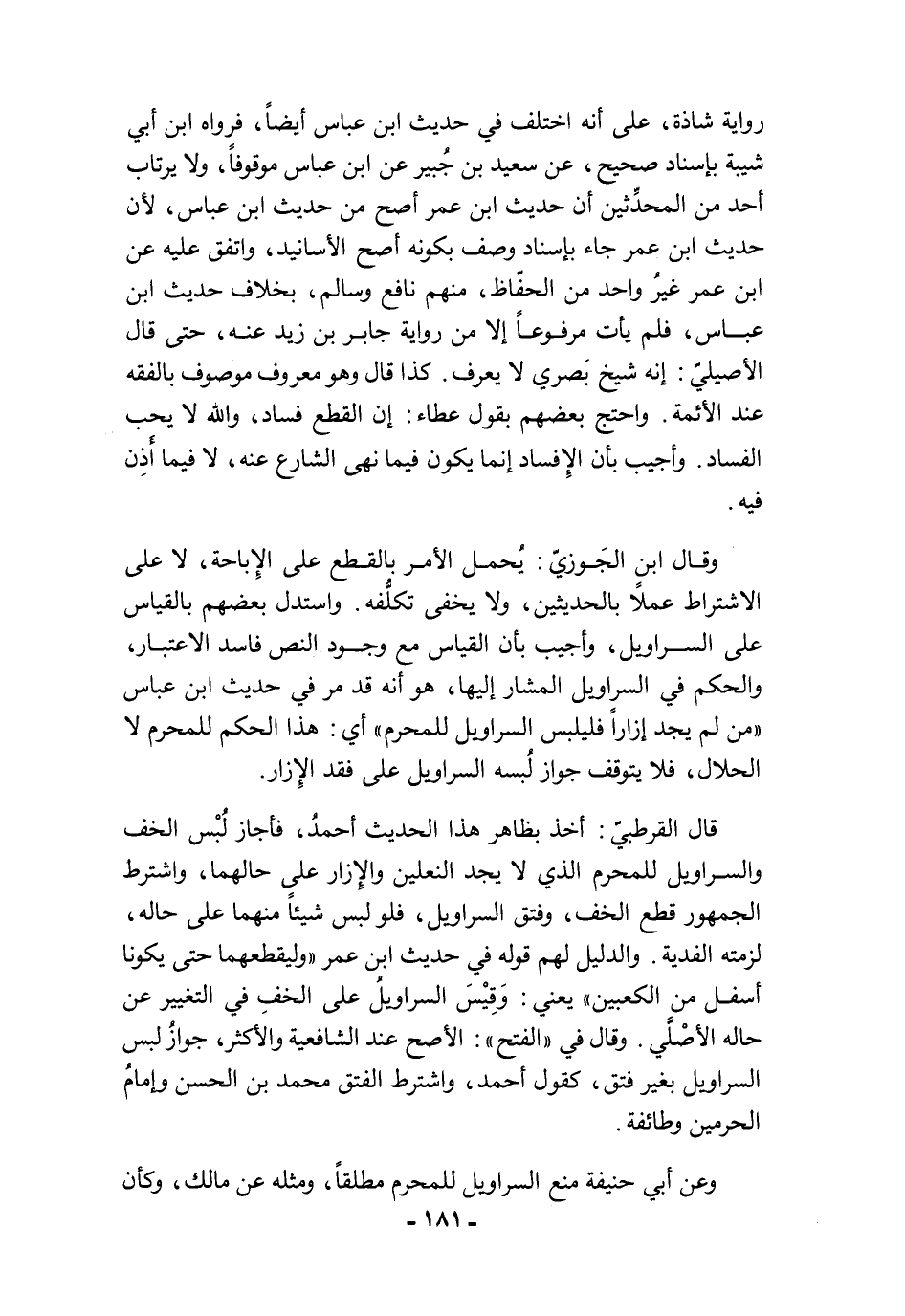 قال القرطبيّ: أخذ بظاهر هذا الحديث أحمدُ، فأجاز لُبْس الخف والسراويل للمحرم الذي لا يجد النعلين والإِزار علي حالهما، واشترط الجمهور قطع الخف، وفتق السراويل، فلو لبس شيئاً منهما على حاله، لزمته الفدية. والدليل لهم قوله في حديث ابن عمر "وليقطعهما حتى يكونا أسفل من الكعبين" يعني: وَقِيْسَ السراويلُ على الخفِ في التغيير عن حاله الأصْلَّي. وقال في "الفتح": الأصح عند الشافعية والأكثر، جوازُ لبس السراويل بغير فتق، كقول أحمد، واشترط الفتق محمد بن الحسن وإمامُ الحرمين وطائفة.