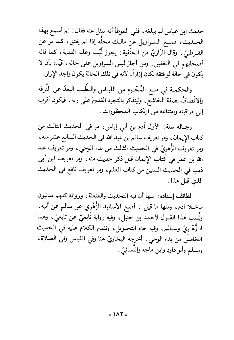 لطائف إسناده: منها أن فيه التحديث والعنعنة، ورواته كلهم مدنيون ماخلا آدم، ومنها ما قيل: أصح الأسانيد الزُّهْري عن سالم عن أبيه، ونُسِب هذا القول لأحمد بن حنبل، وفيه رواية تابعيّ عن تابعيّ، وهما الزُّهْرِيّ وسالم، وفيه حاء التحويل، وتقدم الكلام عليه في الحديث الخامس من بدء الوحي. أخرجه البخاريّ هنا وفي اللباس وفي الصلاة، ومسلم وأبو داود وابن ماجه والنَّسائِيّ.
