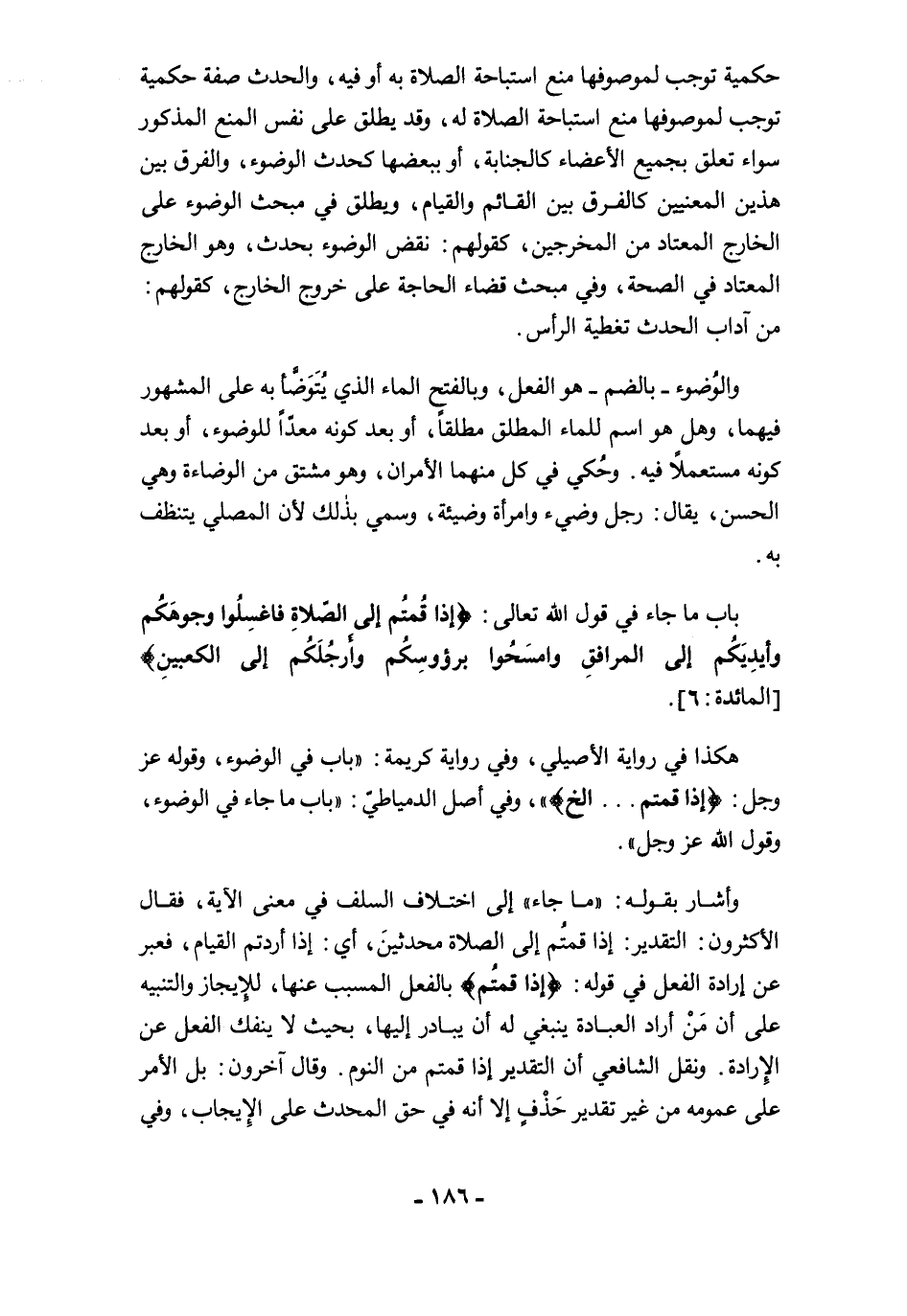 وأشار بقوله: "ما جاء" إلى اختلاف السلف في معنى الآية، فقال الأكثرون: التقدير: إذا قمتُم إلى الصلاة محدثينَ، أي: إذا أردتم القيام، فعبر عن ارادة الفعل في قوله: {إذا قمتُم} بالفعل المسبب عنها, للإيجاز والتنبيه على أن مَنْ أراد العبادة ينبغي له أن يبادر إليها، بحيث لا ينفك الفعل عن الِإرادة. ونقل الشافعي أن التقدير إذا قمتم من النوم. وقال آخرون: بل الأمر على عمومه من غير تقدير حَذْفٍ إلا أنه في حق المحدث على الإيجاب، وفي